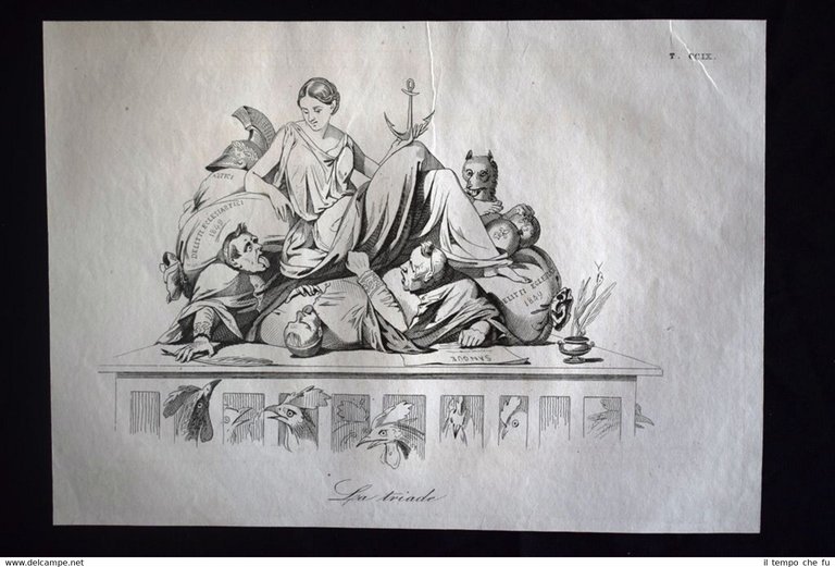Preziosa ottocentina allegorico - caricaturale Tema: Tre porporati, Altieri, Della-Genga e Vannicelli eran gli eletti a reggere Roma e lo stato. La triade posava su un passato di sangue e rappresentava il colmo delle usurpazioni del clero: i tre cardinali s'insediarono nella reggia dei Papi il primo giorno d'agosto per esercitare il potere temporale Bella e rara incisione all'acquaforte di satira pungente e dissacrante sui Moti del 1848, detti anche Rivoluzione del '48 o Primavera dei Popoli, che sconvolsero l'Italia e tutta l'Europa nel 1848 e 1849. Estratta dall'introvabile: Don Pirlone a Roma. Memorie di un Italiano dal 1°settembre 1848 al 31 dicembre 1850. Autore: Michelangelo Pinto Editore: Alessandro Fontana Anno di pubblicazione: 1851 DON PIRLONE - 015/CCIX Dimensioni Cm 22,00 x 16,00 Qualora vogliate delle scansioni migliori contattateci, soddisferemo ogni vostra richiesta. Contesto storico: I moti del 1848, detti anche rivoluzione del '48 o Primavera dei popoli furono un'ondata di moti rivoluzionari borghesi che sconvolsero l'Europa nel 1848 e nel 1849. Scopo dei moti fu abbattere i governi della Restaurazione per sostituirli con governi liberali. Il loro impatto storico fu così profondo e violento che nel linguaggio corrente è entrata in uso l'espressione «fare un quarantotto» per sottintendere una improvvisa confusione e scompiglio. La prima agitazione europea del 1848 si verificò in Italia: la rivoluzione siciliana che esplose il 12 gennaio di quell'anno, che rappresentò la prima miccia dell'esplosione europea. L'insurrezione siciliana, infatti, spinse in un primo momento i Borbone a concedere il ritorno nell'Isola alla costituzione del 1812. Seguì una rivoluzione a Napoli, il 27, che costrinse, due giorni dopo, Ferdinando II a promettere una Costituzione, promulgata l'11 febbraio. Lo stesso 11 febbraio Leopoldo II di Toscana, cugino primo dell'imperatore Ferdinando I d'Austria, concesse la Costituzione, nella generale approvazione dei suoi sudditi. L'esempio borbonico fu seguito da Carlo Alberto di Savoia con lo Statuto Albertino e da Papa Pio IX con lo Statuto Fondamentale. Solo il re piemontese mantenne però lo Statuto. In Sicilia il parlamento proclamò in marzo l'indipendenza, che sarebbe durata fino al maggio 1849. Nel napoletano la concessione e la successiva repressione delle libertà costituzionali, portò dal maggio al settembre di quell'anno a una serie di moti. In tutto il Regno Lombardo-Veneto scoppiarono rivolte, come le Cinque giornate di Milano che sfociarono nella prima guerra di indipendenza. Nello Stato Pontificio una rivolta interna estromise papa Pio IX dai suoi poteri temporali e portò alla costituzione della Repubblica Romana. La rivoluzione delle Cinque giornate di Milano e altre proteste indussero il Re Carlo Alberto a dichiarare guerra all'Austria. Le truppe vennero presto sconfitte e solo quelle francesi poterono far retrocedere gli austriaci. La successiva ascesa al trono di Vittorio Emanuele II fece del Piemonte il motore propulsore del processo di unificazione italiana che tuttavia si sarebbe ottenuto solo nel 1861. Per quanto i Moti del '48 furono sedati abbastanza velocemente, le vittime furono decine di migliaia: il destino della democrazia europea ci è sfuggito di mano dichiarerà Pierre-Joseph Proudhon. Gli storici concordano che la Primavera dei popoli fu, alla fin fine, soprattutto un sanguinoso fallimento, se si eccettua la concessione dello Statuto Albertino nel Regno di Sardegna da parte di Carlo Alberto di Savoia, l'unica costituzione non revocata di quelle concesse o votate nel 1848-49. Vi furono tuttavia radicali e notevoli effetti a lungo termine: Germania e Italia sarebbero presto arrivate all'unificazione facendo leva anche sulla necessità di autodeterminazione dei popoli. Analogamente l'Ungheria sarebbe giunta ad un parziale riconoscimento della propria autonomia (a discapito della popolazione slava) grazie all'Ausgleich del 1867. In Prussia e Austria fu abolito il feudalesimo, mentre in Russia fu eliminata la servitù della gleba nel 1861. Tavola allegorico - caricaturale sullo stato dell'Italia del tempo, incisione su rame ricca di significato e rappresentazione mediante satirica dissacrante della condizione della nostra penisola oppressa. Le tavole dell'opera furono in parte riprese dal giornale romano Don Pirlone, quotidiano, uscito dal 1 settembre 1848 al 2 luglio 1849 (con una interruzione dl 29 aprile al 7 maggio 1849), ma in parte furono realizzate appositamente per questa opera. Tra gli incisori sono presenti anche i nomi di Ratti, Vaiani, Monneret, Gallucci, Pichi, Masutti. Il titolo Don Pirlone deriva quasi sicuramente da una maschera creata dallo scrittore satirico Girolamo Gigli (1660 - 1722). Si trattava di una specie di Tartufo molieresco, ispirato ad una figura reale, il canonico Feliciati di Sarteano. Nei tre volumi l'avvocato Michelangiolo Pinto raccolse tutto il pubblicato del giornale, che fu il più temuto e allo stesso tempo il più