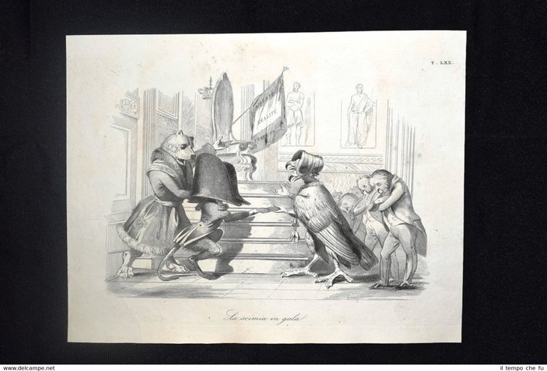Preziosa ottocentina allegorico - caricaturale Tema: Dopo l'Ungheria, che ha dichiarato l'imperatore austriaco per sempre decaduto dal trono ungherese, è la volta della Repubblica Francese con l'elezione del presidente della Repubblica Luigi Napoleone Bonaparte, vestito d'ogni difetto, spoglio d'ogni virtù dello zio Bella e rara incisione all'acquaforte di satira pungente e dissacrante sui Moti del 1848, detti anche Rivoluzione del '48 o Primavera dei Popoli, che sconvolsero l'Italia e tutta l'Europa nel 1848 e 1849. Estratta dall'introvabile: Don Pirlone a Roma. Memorie di un Italiano dal 1°settembre 1848 al 31 dicembre 1850. Autore: Michelangelo Pinto Editore: Alessandro Fontana Anno di pubblicazione: 1851 DON PIRLONE - 006/LXX Dimensioni Cm 22,00 x 16,00 Qualora vogliate delle scansioni migliori contattateci, soddisferemo ogni vostra richiesta. Contesto storico: I moti del 1848, detti anche rivoluzione del '48 o Primavera dei popoli furono un'ondata di moti rivoluzionari borghesi che sconvolsero l'Europa nel 1848 e nel 1849. Scopo dei moti fu abbattere i governi della Restaurazione per sostituirli con governi liberali. Il loro impatto storico fu così profondo e violento che nel linguaggio corrente è entrata in uso l'espressione «fare un quarantotto» per sottintendere una improvvisa confusione e scompiglio. La prima agitazione europea del 1848 si verificò in Italia: la rivoluzione siciliana che esplose il 12 gennaio di quell'anno, che rappresentò la prima miccia dell'esplosione europea. L'insurrezione siciliana, infatti, spinse in un primo momento i Borbone a concedere il ritorno nell'Isola alla costituzione del 1812. Seguì una rivoluzione a Napoli, il 27, che costrinse, due giorni dopo, Ferdinando II a promettere una Costituzione, promulgata l'11 febbraio. Lo stesso 11 febbraio Leopoldo II di Toscana, cugino primo dell'imperatore Ferdinando I d'Austria, concesse la Costituzione, nella generale approvazione dei suoi sudditi. L'esempio borbonico fu seguito da Carlo Alberto di Savoia con lo Statuto Albertino e da Papa Pio IX con lo Statuto Fondamentale. Solo il re piemontese mantenne però lo Statuto. In Sicilia il parlamento proclamò in marzo l'indipendenza, che sarebbe durata fino al maggio 1849. Nel napoletano la concessione e la successiva repressione delle libertà costituzionali, portò dal maggio al settembre di quell'anno a una serie di moti. In tutto il Regno Lombardo-Veneto scoppiarono rivolte, come le Cinque giornate di Milano che sfociarono nella prima guerra di indipendenza. Nello Stato Pontificio una rivolta interna estromise papa Pio IX dai suoi poteri temporali e portò alla costituzione della Repubblica Romana. La rivoluzione delle Cinque giornate di Milano e altre proteste indussero il Re Carlo Alberto a dichiarare guerra all'Austria. Le truppe vennero presto sconfitte e solo quelle francesi poterono far retrocedere gli austriaci. La successiva ascesa al trono di Vittorio Emanuele II fece del Piemonte il motore propulsore del processo di unificazione italiana che tuttavia si sarebbe ottenuto solo nel 1861. Per quanto i Moti del '48 furono sedati abbastanza velocemente, le vittime furono decine di migliaia: il destino della democrazia europea ci è sfuggito di mano dichiarerà Pierre-Joseph Proudhon. Gli storici concordano che la Primavera dei popoli fu, alla fin fine, soprattutto un sanguinoso fallimento, se si eccettua la concessione dello Statuto Albertino nel Regno di Sardegna da parte di Carlo Alberto di Savoia, l'unica costituzione non revocata di quelle concesse o votate nel 1848-49. Vi furono tuttavia radicali e notevoli effetti a lungo termine: Germania e Italia sarebbero presto arrivate all'unificazione facendo leva anche sulla necessità di autodeterminazione dei popoli. Analogamente l'Ungheria sarebbe giunta ad un parziale riconoscimento della propria autonomia (a discapito della popolazione slava) grazie all'Ausgleich del 1867. In Prussia e Austria fu abolito il feudalesimo, mentre in Russia fu eliminata la servitù della gleba nel 1861. Tavola allegorico - caricaturale sullo stato dell'Italia del tempo, incisione su rame ricca di significato e rappresentazione mediante satirica dissacrante della condizione della nostra penisola oppressa. Le tavole dell'opera furono in parte riprese dal giornale romano Don Pirlone, quotidiano, uscito dal 1 settembre 1848 al 2 luglio 1849 (con una interruzione dl 29 aprile al 7 maggio 1849), ma in parte furono realizzate appositamente per questa opera. Tra gli incisori sono presenti anche i nomi di Ratti, Vaiani, Monneret, Gallucci, Pichi, Masutti. Il titolo Don Pirlone deriva quasi sicuramente da una maschera creata dallo scrittore satirico Girolamo Gigli (1660 - 1722). Si trattava di una specie di Tartufo molieresco, ispirato ad una figura reale, il canonico Feliciati di Sarteano. Nei tre volumi l'avvocato Michelangiolo Pinto raccolse tutto il pubblicato del giornale, che fu il più temuto e allo stesso tempo il più apprezzato tra i molteplici giornal