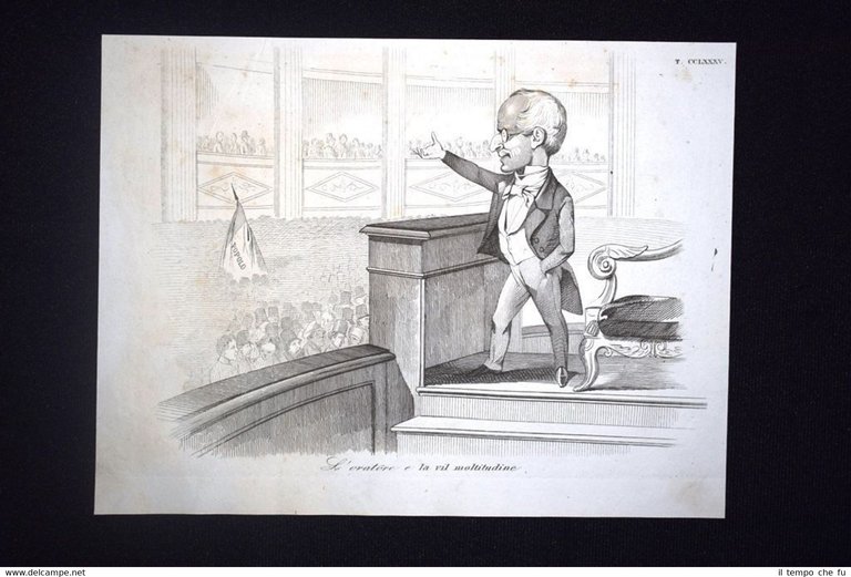Preziosa ottocentina allegorico - caricaturale Tema: In Francia con le menzogne di Marie Joseph Louis Adolphe Thiers la rappresentanza della nazione torna a essere rappresentanza di casta, e nel sacrario dell'uguaglianza emergono nuovamente i privilegi di pochi. Egli si rivolge alle classi più utili e industriose del popolo con l'appellativo di "vil moltitudine", abusando del dono di Dio per insultare la sua gente Bella e rara incisione all'acquaforte di satira pungente e dissacrante sui Moti del 1848, detti anche Rivoluzione del '48 o Primavera dei Popoli, che sconvolsero l'Italia e tutta l'Europa nel 1848 e 1849. Estratta dall'introvabile: Don Pirlone a Roma. Memorie di un Italiano dal 1°settembre 1848 al 31 dicembre 1850. Autore: Michelangelo Pinto Editore: Alessandro Fontana Anno di pubblicazione: 1851 DON PIRLONE - 022/CCLXXXV Dimensioni Cm 22,00 x 16,00 Qualora vogliate delle scansioni migliori contattateci, soddisferemo ogni vostra richiesta. Contesto storico: I moti del 1848, detti anche rivoluzione del '48 o Primavera dei popoli furono un'ondata di moti rivoluzionari borghesi che sconvolsero l'Europa nel 1848 e nel 1849. Scopo dei moti fu abbattere i governi della Restaurazione per sostituirli con governi liberali. Il loro impatto storico fu così profondo e violento che nel linguaggio corrente è entrata in uso l'espressione «fare un quarantotto» per sottintendere una improvvisa confusione e scompiglio. La prima agitazione europea del 1848 si verificò in Italia: la rivoluzione siciliana che esplose il 12 gennaio di quell'anno, che rappresentò la prima miccia dell'esplosione europea. L'insurrezione siciliana, infatti, spinse in un primo momento i Borbone a concedere il ritorno nell'Isola alla costituzione del 1812. Seguì una rivoluzione a Napoli, il 27, che costrinse, due giorni dopo, Ferdinando II a promettere una Costituzione, promulgata l'11 febbraio. Lo stesso 11 febbraio Leopoldo II di Toscana, cugino primo dell'imperatore Ferdinando I d'Austria, concesse la Costituzione, nella generale approvazione dei suoi sudditi. L'esempio borbonico fu seguito da Carlo Alberto di Savoia con lo Statuto Albertino e da Papa Pio IX con lo Statuto Fondamentale. Solo il re piemontese mantenne però lo Statuto. In Sicilia il parlamento proclamò in marzo l'indipendenza, che sarebbe durata fino al maggio 1849. Nel napoletano la concessione e la successiva repressione delle libertà costituzionali, portò dal maggio al settembre di quell'anno a una serie di moti. In tutto il Regno Lombardo-Veneto scoppiarono rivolte, come le Cinque giornate di Milano che sfociarono nella prima guerra di indipendenza. Nello Stato Pontificio una rivolta interna estromise papa Pio IX dai suoi poteri temporali e portò alla costituzione della Repubblica Romana. La rivoluzione delle Cinque giornate di Milano e altre proteste indussero il Re Carlo Alberto a dichiarare guerra all'Austria. Le truppe vennero presto sconfitte e solo quelle francesi poterono far retrocedere gli austriaci. La successiva ascesa al trono di Vittorio Emanuele II fece del Piemonte il motore propulsore del processo di unificazione italiana che tuttavia si sarebbe ottenuto solo nel 1861. Per quanto i Moti del '48 furono sedati abbastanza velocemente, le vittime furono decine di migliaia: il destino della democrazia europea ci è sfuggito di mano dichiarerà Pierre-Joseph Proudhon. Gli storici concordano che la Primavera dei popoli fu, alla fin fine, soprattutto un sanguinoso fallimento, se si eccettua la concessione dello Statuto Albertino nel Regno di Sardegna da parte di Carlo Alberto di Savoia, l'unica costituzione non revocata di quelle concesse o votate nel 1848-49. Vi furono tuttavia radicali e notevoli effetti a lungo termine: Germania e Italia sarebbero presto arrivate all'unificazione facendo leva anche sulla necessità di autodeterminazione dei popoli. Analogamente l'Ungheria sarebbe giunta ad un parziale riconoscimento della propria autonomia (a discapito della popolazione slava) grazie all'Ausgleich del 1867. In Prussia e Austria fu abolito il feudalesimo, mentre in Russia fu eliminata la servitù della gleba nel 1861. Tavola allegorico - caricaturale sullo stato dell'Italia del tempo, incisione su rame ricca di significato e rappresentazione mediante satirica dissacrante della condizione della nostra penisola oppressa. Le tavole dell'opera furono in parte riprese dal giornale romano Don Pirlone, quotidiano, uscito dal 1 settembre 1848 al 2 luglio 1849 (con una interruzione dl 29 aprile al 7 maggio 1849), ma in parte furono realizzate appositamente per questa opera. Tra gli incisori sono presenti anche i nomi di Ratti, Vaiani, Monneret, Gallucci, Pichi, Masutti. Il titolo Don Pirlone deriva quasi sicuramente da una maschera creata dallo scrittore satirico Girolamo Gigli (1660 - 1722). Si trattava di una specie di Tartufo molieresco, ispirato ad una figura reale, il canonico Feliciati di Sarteano. Nei tre volumi l'avvocato Michelangiolo Pinto raccolse tutto il pubb