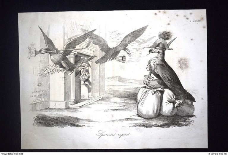 Preziosa ottocentina allegorico - caricaturale Tema: Le chiese cattoliche vengono spogliate di immagini sacre, arredi d'altare e suppellettili, portati via dagli sciacalli imperiali Bella e rara incisione all'acquaforte di satira pungente e dissacrante sui Moti del 1848, detti anche Rivoluzione del '48 o Primavera dei Popoli, che sconvolsero l'Italia e tutta l'Europa nel 1848 e 1849. Estratta dall'introvabile: Don Pirlone a Roma. Memorie di un Italiano dal 1°settembre 1848 al 31 dicembre 1850. Autore: Michelangelo Pinto Editore: Alessandro Fontana Anno di pubblicazione: 1851 DON PIRLONE - 010/CXXXIII Dimensioni Cm 22,00 x 16,00 Qualora vogliate delle scansioni migliori contattateci, soddisferemo ogni vostra richiesta. Contesto storico: I moti del 1848, detti anche rivoluzione del '48 o Primavera dei popoli furono un'ondata di moti rivoluzionari borghesi che sconvolsero l'Europa nel 1848 e nel 1849. Scopo dei moti fu abbattere i governi della Restaurazione per sostituirli con governi liberali. Il loro impatto storico fu così profondo e violento che nel linguaggio corrente è entrata in uso l'espressione «fare un quarantotto» per sottintendere una improvvisa confusione e scompiglio. La prima agitazione europea del 1848 si verificò in Italia: la rivoluzione siciliana che esplose il 12 gennaio di quell'anno, che rappresentò la prima miccia dell'esplosione europea. L'insurrezione siciliana, infatti, spinse in un primo momento i Borbone a concedere il ritorno nell'Isola alla costituzione del 1812. Seguì una rivoluzione a Napoli, il 27, che costrinse, due giorni dopo, Ferdinando II a promettere una Costituzione, promulgata l'11 febbraio. Lo stesso 11 febbraio Leopoldo II di Toscana, cugino primo dell'imperatore Ferdinando I d'Austria, concesse la Costituzione, nella generale approvazione dei suoi sudditi. L'esempio borbonico fu seguito da Carlo Alberto di Savoia con lo Statuto Albertino e da Papa Pio IX con lo Statuto Fondamentale. Solo il re piemontese mantenne però lo Statuto. In Sicilia il parlamento proclamò in marzo l'indipendenza, che sarebbe durata fino al maggio 1849. Nel napoletano la concessione e la successiva repressione delle libertà costituzionali, portò dal maggio al settembre di quell'anno a una serie di moti. In tutto il Regno Lombardo-Veneto scoppiarono rivolte, come le Cinque giornate di Milano che sfociarono nella prima guerra di indipendenza. Nello Stato Pontificio una rivolta interna estromise papa Pio IX dai suoi poteri temporali e portò alla costituzione della Repubblica Romana. La rivoluzione delle Cinque giornate di Milano e altre proteste indussero il Re Carlo Alberto a dichiarare guerra all'Austria. Le truppe vennero presto sconfitte e solo quelle francesi poterono far retrocedere gli austriaci. La successiva ascesa al trono di Vittorio Emanuele II fece del Piemonte il motore propulsore del processo di unificazione italiana che tuttavia si sarebbe ottenuto solo nel 1861. Per quanto i Moti del '48 furono sedati abbastanza velocemente, le vittime furono decine di migliaia: il destino della democrazia europea ci è sfuggito di mano dichiarerà Pierre-Joseph Proudhon. Gli storici concordano che la Primavera dei popoli fu, alla fin fine, soprattutto un sanguinoso fallimento, se si eccettua la concessione dello Statuto Albertino nel Regno di Sardegna da parte di Carlo Alberto di Savoia, l'unica costituzione non revocata di quelle concesse o votate nel 1848-49. Vi furono tuttavia radicali e notevoli effetti a lungo termine: Germania e Italia sarebbero presto arrivate all'unificazione facendo leva anche sulla necessità di autodeterminazione dei popoli. Analogamente l'Ungheria sarebbe giunta ad un parziale riconoscimento della propria autonomia (a discapito della popolazione slava) grazie all'Ausgleich del 1867. In Prussia e Austria fu abolito il feudalesimo, mentre in Russia fu eliminata la servitù della gleba nel 1861. Tavola allegorico - caricaturale sullo stato dell'Italia del tempo, incisione su rame ricca di significato e rappresentazione mediante satirica dissacrante della condizione della nostra penisola oppressa. Le tavole dell'opera furono in parte riprese dal giornale romano Don Pirlone, quotidiano, uscito dal 1 settembre 1848 al 2 luglio 1849 (con una interruzione dl 29 aprile al 7 maggio 1849), ma in parte furono realizzate appositamente per questa opera. Tra gli incisori sono presenti anche i nomi di Ratti, Vaiani, Monneret, Gallucci, Pichi, Masutti. Il titolo Don Pirlone deriva quasi sicuramente da una maschera creata dallo scrittore satirico Girolamo Gigli (1660 - 1722). Si trattava di una specie di Tartufo molieresco, ispirato ad una figura reale, il canonico Feliciati di Sarteano. Nei tre volumi l'avvocato Michelangiolo Pinto raccolse tutto il pubblicato del giornale, che fu il più temuto e allo stesso tempo il più apprezzato tra i molteplici giornali satirici che si pubblicavano nella Roma di Pio IX all'epoca delle grandi riforme volute dal Papa. I romani gli dedicarono perfino