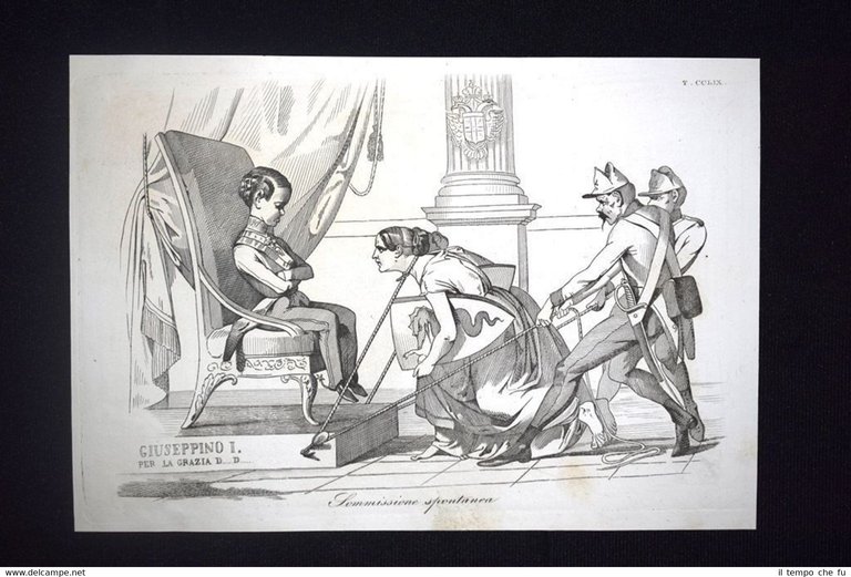 Preziosa ottocentina allegorico - caricaturale Tema: Sotto la minaccia di danni ingenti, i consigli municipali italiani vengono costretti ad offrire al trono imperiale l'omaggio delle province, e l'obbedienza spontanea all'austriaca dominazione Bella e rara incisione all'acquaforte di satira pungente e dissacrante sui Moti del 1848, detti anche Rivoluzione del '48 o Primavera dei Popoli, che sconvolsero l'Italia e tutta l'Europa nel 1848 e 1849. Estratta dall'introvabile: Don Pirlone a Roma. Memorie di un Italiano dal 1°settembre 1848 al 31 dicembre 1850. Autore: Michelangelo Pinto Editore: Alessandro Fontana Anno di pubblicazione: 1851 DON PIRLONE - 020/CCLIX Dimensioni Cm 22,00 x 16,00 Qualora vogliate delle scansioni migliori contattateci, soddisferemo ogni vostra richiesta. Contesto storico: I moti del 1848, detti anche rivoluzione del '48 o Primavera dei popoli furono un'ondata di moti rivoluzionari borghesi che sconvolsero l'Europa nel 1848 e nel 1849. Scopo dei moti fu abbattere i governi della Restaurazione per sostituirli con governi liberali. Il loro impatto storico fu così profondo e violento che nel linguaggio corrente è entrata in uso l'espressione «fare un quarantotto» per sottintendere una improvvisa confusione e scompiglio. La prima agitazione europea del 1848 si verificò in Italia: la rivoluzione siciliana che esplose il 12 gennaio di quell'anno, che rappresentò la prima miccia dell'esplosione europea. L'insurrezione siciliana, infatti, spinse in un primo momento i Borbone a concedere il ritorno nell'Isola alla costituzione del 1812. Seguì una rivoluzione a Napoli, il 27, che costrinse, due giorni dopo, Ferdinando II a promettere una Costituzione, promulgata l'11 febbraio. Lo stesso 11 febbraio Leopoldo II di Toscana, cugino primo dell'imperatore Ferdinando I d'Austria, concesse la Costituzione, nella generale approvazione dei suoi sudditi. L'esempio borbonico fu seguito da Carlo Alberto di Savoia con lo Statuto Albertino e da Papa Pio IX con lo Statuto Fondamentale. Solo il re piemontese mantenne però lo Statuto. In Sicilia il parlamento proclamò in marzo l'indipendenza, che sarebbe durata fino al maggio 1849. Nel napoletano la concessione e la successiva repressione delle libertà costituzionali, portò dal maggio al settembre di quell'anno a una serie di moti. In tutto il Regno Lombardo-Veneto scoppiarono rivolte, come le Cinque giornate di Milano che sfociarono nella prima guerra di indipendenza. Nello Stato Pontificio una rivolta interna estromise papa Pio IX dai suoi poteri temporali e portò alla costituzione della Repubblica Romana. La rivoluzione delle Cinque giornate di Milano e altre proteste indussero il Re Carlo Alberto a dichiarare guerra all'Austria. Le truppe vennero presto sconfitte e solo quelle francesi poterono far retrocedere gli austriaci. La successiva ascesa al trono di Vittorio Emanuele II fece del Piemonte il motore propulsore del processo di unificazione italiana che tuttavia si sarebbe ottenuto solo nel 1861. Per quanto i Moti del '48 furono sedati abbastanza velocemente, le vittime furono decine di migliaia: il destino della democrazia europea ci è sfuggito di mano dichiarerà Pierre-Joseph Proudhon. Gli storici concordano che la Primavera dei popoli fu, alla fin fine, soprattutto un sanguinoso fallimento, se si eccettua la concessione dello Statuto Albertino nel Regno di Sardegna da parte di Carlo Alberto di Savoia, l'unica costituzione non revocata di quelle concesse o votate nel 1848-49. Vi furono tuttavia radicali e notevoli effetti a lungo termine: Germania e Italia sarebbero presto arrivate all'unificazione facendo leva anche sulla necessità di autodeterminazione dei popoli. Analogamente l'Ungheria sarebbe giunta ad un parziale riconoscimento della propria autonomia (a discapito della popolazione slava) grazie all'Ausgleich del 1867. In Prussia e Austria fu abolito il feudalesimo, mentre in Russia fu eliminata la servitù della gleba nel 1861. Tavola allegorico - caricaturale sullo stato dell'Italia del tempo, incisione su rame ricca di significato e rappresentazione mediante satirica dissacrante della condizione della nostra penisola oppressa. Le tavole dell'opera furono in parte riprese dal giornale romano Don Pirlone, quotidiano, uscito dal 1 settembre 1848 al 2 luglio 1849 (con una interruzione dl 29 aprile al 7 maggio 1849), ma in parte furono realizzate appositamente per questa opera. Tra gli incisori sono presenti anche i nomi di Ratti, Vaiani, Monneret, Gallucci, Pichi, Masutti. Il titolo Don Pirlone deriva quasi sicuramente da una maschera creata dallo scrittore satirico Girolamo Gigli (1660 - 1722). Si trattava di una specie di Tartufo molieresco, ispirato ad una figura reale, il canonico Feliciati di Sarteano. Nei tre volumi l'avvocato Michelangiolo Pinto raccolse tutto il pubblicato del giornale, che fu il più temuto e allo stesso tempo il più apprezzato tra i molteplici giornali satirici che si pubblicavano nella Roma di Pio IX all'epoca delle gra