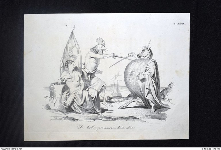Preziosa ottocentina allegorico - caricaturale Tema: La corte di Spagna muove a sostegno del Pontefice, sollecitata da Napoli, incoraggiata dall'Austria, favoreggiata e protetta dalla Francia. L'Italia si ritrova da sola, abbandonata anche dall'Inghilterra che dopo aver lottato lungamente con la Francia per la Sicilia, la consegnava ai Borbone Bella e rara incisione all'acquaforte di satira pungente e dissacrante sui Moti del 1848, detti anche Rivoluzione del '48 o Primavera dei Popoli, che sconvolsero l'Italia e tutta l'Europa nel 1848 e 1849. Estratta dall'introvabile: Don Pirlone a Roma. Memorie di un Italiano dal 1°settembre 1848 al 31 dicembre 1850. Autore: Michelangelo Pinto Editore: Alessandro Fontana Anno di pubblicazione: 1851 DON PIRLONE - 008/LXXXIX Dimensioni Cm 22,00 x 16,00 Qualora vogliate delle scansioni migliori contattateci, soddisferemo ogni vostra richiesta. Contesto storico: I moti del 1848, detti anche rivoluzione del '48 o Primavera dei popoli furono un'ondata di moti rivoluzionari borghesi che sconvolsero l'Europa nel 1848 e nel 1849. Scopo dei moti fu abbattere i governi della Restaurazione per sostituirli con governi liberali. Il loro impatto storico fu così profondo e violento che nel linguaggio corrente è entrata in uso l'espressione «fare un quarantotto» per sottintendere una improvvisa confusione e scompiglio. La prima agitazione europea del 1848 si verificò in Italia: la rivoluzione siciliana che esplose il 12 gennaio di quell'anno, che rappresentò la prima miccia dell'esplosione europea. L'insurrezione siciliana, infatti, spinse in un primo momento i Borbone a concedere il ritorno nell'Isola alla costituzione del 1812. Seguì una rivoluzione a Napoli, il 27, che costrinse, due giorni dopo, Ferdinando II a promettere una Costituzione, promulgata l'11 febbraio. Lo stesso 11 febbraio Leopoldo II di Toscana, cugino primo dell'imperatore Ferdinando I d'Austria, concesse la Costituzione, nella generale approvazione dei suoi sudditi. L'esempio borbonico fu seguito da Carlo Alberto di Savoia con lo Statuto Albertino e da Papa Pio IX con lo Statuto Fondamentale. Solo il re piemontese mantenne però lo Statuto. In Sicilia il parlamento proclamò in marzo l'indipendenza, che sarebbe durata fino al maggio 1849. Nel napoletano la concessione e la successiva repressione delle libertà costituzionali, portò dal maggio al settembre di quell'anno a una serie di moti. In tutto il Regno Lombardo-Veneto scoppiarono rivolte, come le Cinque giornate di Milano che sfociarono nella prima guerra di indipendenza. Nello Stato Pontificio una rivolta interna estromise papa Pio IX dai suoi poteri temporali e portò alla costituzione della Repubblica Romana. La rivoluzione delle Cinque giornate di Milano e altre proteste indussero il Re Carlo Alberto a dichiarare guerra all'Austria. Le truppe vennero presto sconfitte e solo quelle francesi poterono far retrocedere gli austriaci. La successiva ascesa al trono di Vittorio Emanuele II fece del Piemonte il motore propulsore del processo di unificazione italiana che tuttavia si sarebbe ottenuto solo nel 1861. Per quanto i Moti del '48 furono sedati abbastanza velocemente, le vittime furono decine di migliaia: il destino della democrazia europea ci è sfuggito di mano dichiarerà Pierre-Joseph Proudhon. Gli storici concordano che la Primavera dei popoli fu, alla fin fine, soprattutto un sanguinoso fallimento, se si eccettua la concessione dello Statuto Albertino nel Regno di Sardegna da parte di Carlo Alberto di Savoia, l'unica costituzione non revocata di quelle concesse o votate nel 1848-49. Vi furono tuttavia radicali e notevoli effetti a lungo termine: Germania e Italia sarebbero presto arrivate all'unificazione facendo leva anche sulla necessità di autodeterminazione dei popoli. Analogamente l'Ungheria sarebbe giunta ad un parziale riconoscimento della propria autonomia (a discapito della popolazione slava) grazie all'Ausgleich del 1867. In Prussia e Austria fu abolito il feudalesimo, mentre in Russia fu eliminata la servitù della gleba nel 1861. Tavola allegorico - caricaturale sullo stato dell'Italia del tempo, incisione su rame ricca di significato e rappresentazione mediante satirica dissacrante della condizione della nostra penisola oppressa. Le tavole dell'opera furono in parte riprese dal giornale romano Don Pirlone, quotidiano, uscito dal 1 settembre 1848 al 2 luglio 1849 (con una interruzione dl 29 aprile al 7 maggio 1849), ma in parte furono realizzate appositamente per questa opera. Tra gli incisori sono presenti anche i nomi di Ratti, Vaiani, Monneret, Gallucci, Pichi, Masutti. Il titolo Don Pirlone deriva quasi sicuramente da una maschera creata dallo scrittore satirico Girolamo Gigli (1660 - 1722). Si trattava di una specie di Tartufo molieresco, ispirato ad una figura reale, il canonico Feliciati di Sarteano. Nei tre volumi l'avvocato Michelangiolo Pinto raccolse tutto il pubblicato del giornale, che fu il più temuto e allo stesso tempo il più appr