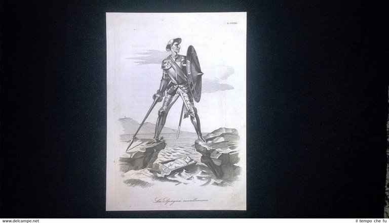 Preziosa ottocentina allegorico - caricaturale Tema: La Spagna, che durante la rivoluzione aveva lavato il sangue di tanti martiri col sangue di tanti monaci, fu tra le prime potenze d'Europa a impugnare la lancia e offrirsi come paladino di Papa Pio IX Bella e rara incisione all'acquaforte di satira pungente e dissacrante sui Moti del 1848, detti anche Rivoluzione del '48 o Primavera dei Popoli, che sconvolsero l'Italia e tutta l'Europa nel 1848 e 1849. Estratta dall'introvabile: Don Pirlone a Roma. Memorie di un Italiano dal 1°settembre 1848 al 31 dicembre 1850. Autore: Michelangelo Pinto Editore: Alessandro Fontana Anno di pubblicazione: 1851 DON PIRLONE - 024/CCCIII Dimensioni Cm 16,00 x 22,00 Qualora vogliate delle scansioni migliori contattateci, soddisferemo ogni vostra richiesta. Contesto storico: I moti del 1848, detti anche rivoluzione del '48 o Primavera dei popoli furono un'ondata di moti rivoluzionari borghesi che sconvolsero l'Europa nel 1848 e nel 1849. Scopo dei moti fu abbattere i governi della Restaurazione per sostituirli con governi liberali. Il loro impatto storico fu così profondo e violento che nel linguaggio corrente è entrata in uso l'espressione «fare un quarantotto» per sottintendere una improvvisa confusione e scompiglio. La prima agitazione europea del 1848 si verificò in Italia: la rivoluzione siciliana che esplose il 12 gennaio di quell'anno, che rappresentò la prima miccia dell'esplosione europea. L'insurrezione siciliana, infatti, spinse in un primo momento i Borbone a concedere il ritorno nell'Isola alla costituzione del 1812. Seguì una rivoluzione a Napoli, il 27, che costrinse, due giorni dopo, Ferdinando II a promettere una Costituzione, promulgata l'11 febbraio. Lo stesso 11 febbraio Leopoldo II di Toscana, cugino primo dell'imperatore Ferdinando I d'Austria, concesse la Costituzione, nella generale approvazione dei suoi sudditi. L'esempio borbonico fu seguito da Carlo Alberto di Savoia con lo Statuto Albertino e da Papa Pio IX con lo Statuto Fondamentale. Solo il re piemontese mantenne però lo Statuto. In Sicilia il parlamento proclamò in marzo l'indipendenza, che sarebbe durata fino al maggio 1849. Nel napoletano la concessione e la successiva repressione delle libertà costituzionali, portò dal maggio al settembre di quell'anno a una serie di moti. In tutto il Regno Lombardo-Veneto scoppiarono rivolte, come le Cinque giornate di Milano che sfociarono nella prima guerra di indipendenza. Nello Stato Pontificio una rivolta interna estromise papa Pio IX dai suoi poteri temporali e portò alla costituzione della Repubblica Romana. La rivoluzione delle Cinque giornate di Milano e altre proteste indussero il Re Carlo Alberto a dichiarare guerra all'Austria. Le truppe vennero presto sconfitte e solo quelle francesi poterono far retrocedere gli austriaci. La successiva ascesa al trono di Vittorio Emanuele II fece del Piemonte il motore propulsore del processo di unificazione italiana che tuttavia si sarebbe ottenuto solo nel 1861. Per quanto i Moti del '48 furono sedati abbastanza velocemente, le vittime furono decine di migliaia: il destino della democrazia europea ci è sfuggito di mano dichiarerà Pierre-Joseph Proudhon. Gli storici concordano che la Primavera dei popoli fu, alla fin fine, soprattutto un sanguinoso fallimento, se si eccettua la concessione dello Statuto Albertino nel Regno di Sardegna da parte di Carlo Alberto di Savoia, l'unica costituzione non revocata di quelle concesse o votate nel 1848-49. Vi furono tuttavia radicali e notevoli effetti a lungo termine: Germania e Italia sarebbero presto arrivate all'unificazione facendo leva anche sulla necessità di autodeterminazione dei popoli. Analogamente l'Ungheria sarebbe giunta ad un parziale riconoscimento della propria autonomia (a discapito della popolazione slava) grazie all'Ausgleich del 1867. In Prussia e Austria fu abolito il feudalesimo, mentre in Russia fu eliminata la servitù della gleba nel 1861. Tavola allegorico - caricaturale sullo stato dell'Italia del tempo, incisione su rame ricca di significato e rappresentazione mediante satirica dissacrante della condizione della nostra penisola oppressa. Le tavole dell'opera furono in parte riprese dal giornale romano Don Pirlone, quotidiano, uscito dal 1 settembre 1848 al 2 luglio 1849 (con una interruzione dl 29 aprile al 7 maggio 1849), ma in parte furono realizzate appositamente per questa opera. Tra gli incisori sono presenti anche i nomi di Ratti, Vaiani, Monneret, Gallucci, Pichi, Masutti. Il titolo Don Pirlone deriva quasi sicuramente da una maschera creata dallo scrittore satirico Girolamo Gigli (1660 - 1722). Si trattava di una specie di Tartufo molieresco, ispirato ad una figura reale, il canonico Feliciati di Sarteano. Nei tre volumi l'avvocato Michelangiolo Pinto raccolse tutto il pubblicato del giornale, che fu il più temuto e allo stesso tempo il più apprezzato tra i molteplici giornali satirici che si pubblicavano nella Roma di Pio IX all'epoca