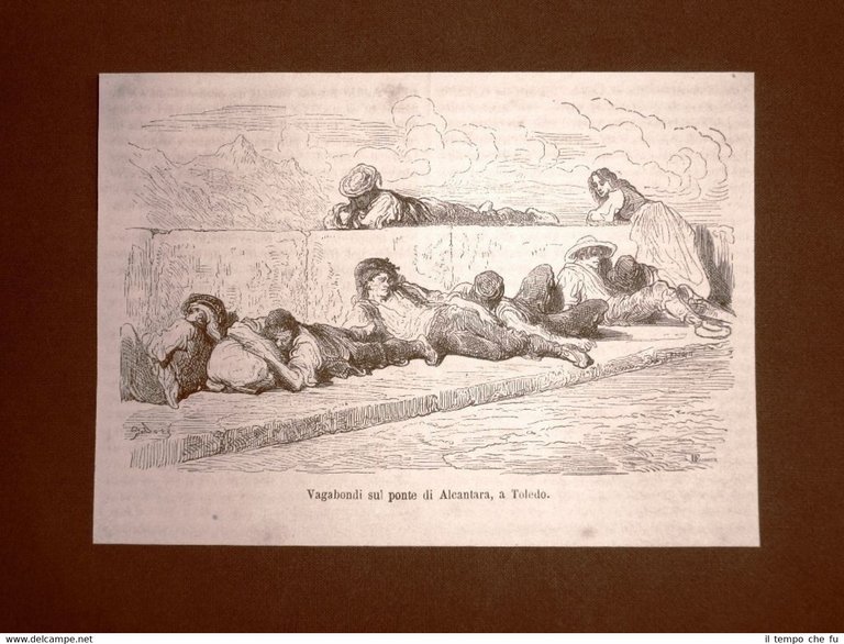 Incisione Gustave Dorè del 1874 Toledo Vagabondi sul Ponte di Alcantara Spagna