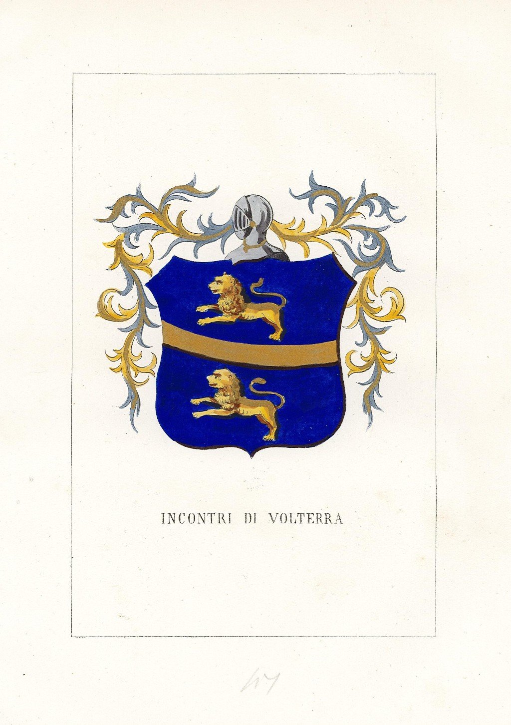 Stampa, antica ed originale, con raffigurato lo stemma araldico della famiglia finemente colorato a mano all'epoca con vivace acquerellatura a tempera. Inserita nell'opera "Storia delle Famiglie Illustri Italiane" pubblicata a Firenze dall'editore Ulisse Diligenti. La stampa è accompagnata da pagine con testo storico descrittivo.