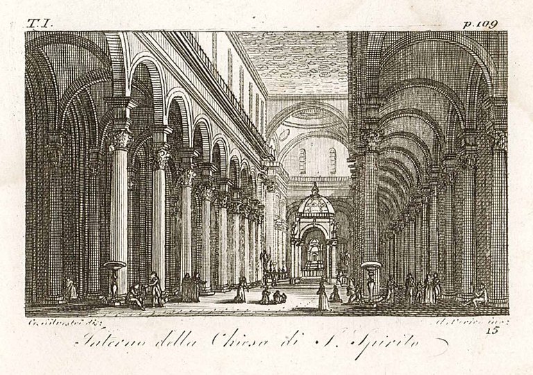 Stampa antica ed originale con veduta interna della Chiesa di S. Spirito. Autore: Verico Antonio. Luogo: Firenze. Anno: 1827. Tecnica: incisione in rame. Dimensioni: 53x91 mm
