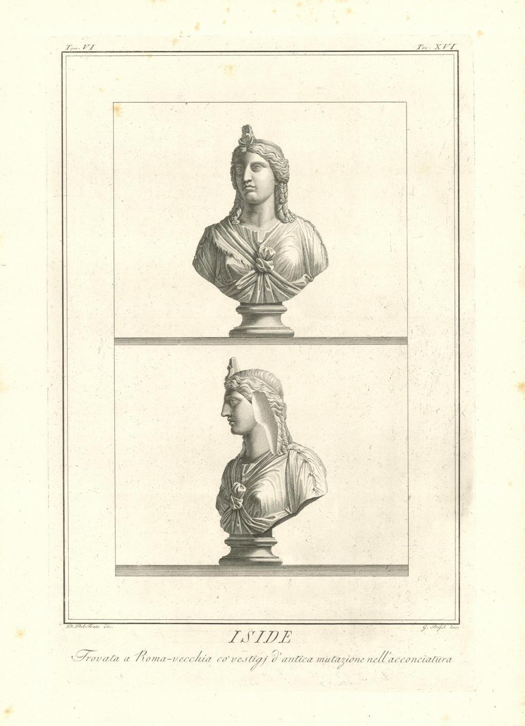 Il busto, ripreso da due punti di vista, ritrae Iside, figura della mitologia egizia, dea della maternità e della fertilità, raffigurata con un trono in testa e un abito annodato sul petto. Inserita nell'opera "Il Museo Pio-Clementino descritto da Ennio Quirino Visconti Direttore del Museo Capitolino - Tomo sesto - Dedicato alla Santita di Nostro Signore PIO SESTO Pontefice Massimo. Edito da Luigi Mirri / Mercante di quadri incontro il Palazzo Bernini. In Roma MDCCXCII con Privilegio Pontificio. Opera dedicata ai Busti del Museo Pio-Clementino. Leggeri segni di foxing ai margini