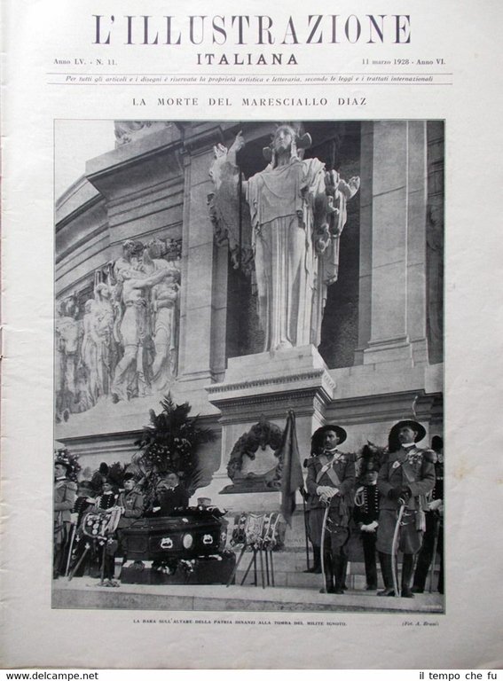 L'Illustrazione Italiana Rivista originale del 11 Marzo 1928 Anno 55 - N. 11 Rarità per appassionati e collezionisti Segue sotto solamente un saggio del ricco contenuto presente Illustrato in copertina (segue foto): La morte del maresciallo Armando Diaz Illustrazione presente nelle pagine interne (segue foto): La carriera del maresciallo attraverso la fotografia Altra Illustrazione presente nelle pagine interne (segue foto): La figlia del reggimento alla Scala Tra gli argomenti trattati e le notizie contenute: Il cordoglio della nazione per la morte di Diaz L'apoteosi del condottiero Roma: le solenni onoranze funebri al duca della Vittoria Il viaggio del principe ereditario in Eritrea Il palazzo ducale e la galleria d'arte moderna in Venezia .e tanto altro ancora! Qualora vogliate maggiori delucidazioni contattateci. In questo negozio troverai un'intera categoria dedicata alla collezione dell'Illustrazione Italiana , ne inseriamo diverse giornalmente. Sotto il link diretto a tutta la collezione: Riviste disponibili Cliccaci sopra, troverai di certo ciò che cerchi! L'illustrazione Italiana è stata una rivista settimanale italiana con sede a Milano, pubblicata ininterrottamente dal 1873 al 1962 per un totale di quasi 5 000 numeri. Fondata a Milano con la testata «Nuova illustrazione universale», fu edita dalla casa editrice Fratelli Treves, fondata da Emilio Treves, il quale fu anche il primo direttore della rivista. L'illustrazione italiana comincia ad avere un'ampia diffusione negli ambienti della medio-alta borghesia, grazie alla qualità degli articoli e soprattutto delle illustrazioni, spesso affidate ad artisti di primo piano come Achille Beltrame, Pietro Scoppetta, Luigi Bompard, Giuseppe Cosenza ed Ettore Ximenes (il quale svolgeva anche le funzioni di vicedirettore), tale qualità fu mantenuta poi nel tempo anche in seguito all'avvento della fotografia, tecnica che vide rappresentati sulle pagine dell'«Illustrazione» alcuni tra i migliori fotogiornalisti nazionali: Armando Bruni, Mario Crimella, Giulio Parisio ed Emilio Sommariva. Per i testi il periodico si avvalse della collaborazione, in qualità di articolisti, di alcuni dei nomi più importanti della letteratura italiana, fra cui ricordiamo Giosuè Carducci, Grazia Deledda e Luigi Pirandello (premi Nobel per la letteratura), lo scrittore verista Giovanni Verga, il poeta Gabriele D'Annunzio, il critico letterario e favolista Luigi Capuana ed Edmondo De Amicis, autore del celeberrimo romanzo "Cuore", capolavoro della letteratura per ragazzi. La grande fortuna dell'Illustrazione Italiana durò fino alla morte di Emilio Treves (1916), dopo la quale, pur avendo ancora tra i propri collaboratori scrittori del calibro di Eugenio Montale, Elio Vittorini, Salvatore Quasimodo, Riccardo Bacchelli, Italo Pietra, Niccolò Giani e Sergio Solmi, la rivista cominciò a mostrare i segni di un lento declino. La promulgazione delle leggi razziali fasciste accelerò il processo in atto: nel 1939 la Treves dovette cedere l'azienda alla Garzanti. Verso la metà del 1942, in seguito agli eventi della seconda guerra mondiale, L'illustrazione rallentò le sue uscite, fino ad essere trasformata in mensile nel 1951 da Livio Garzanti. Gli anni cinquanta videro la crescita vertiginosa dei rotocalchi, settimanali popolari di attualità. «L'Illustrazione Italiana» vide ridursi progressivamente il suo spazio, finché Garzanti la chiuse nel 1962. L'editore Guanda riprese la testata alla fine del 1981 e la ripubblicò con periodicità bimestrale. Il tentativo non incontrò sufficiente fortuna e la rivista fu chiusa nel 1996. Paypal Carta di credito Bonifico bancario Spedizione con posta ordinaria o raccomandata scelta dall'Acquirente nel momento del pagamento Clicca qui per accedere al nostro Store ed al suo sterminato archivio