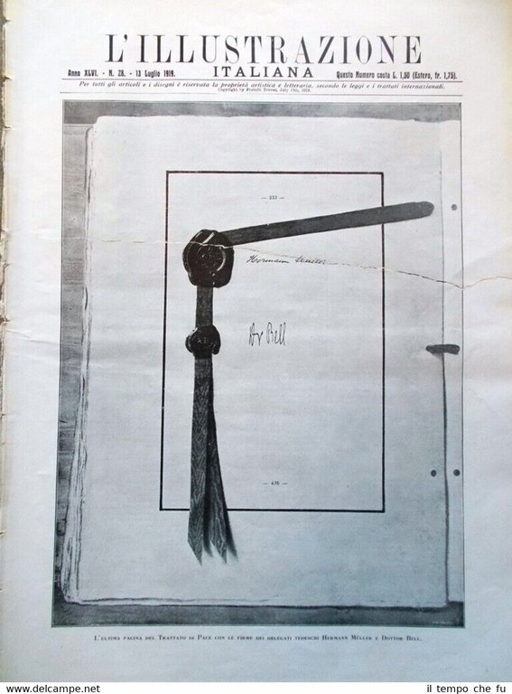 L'Illustrazione Italiana Rivista originale del 13 Luglio 1919 Anno 46 - N. 28 Rarità per appassionati e collezionisti Segue sotto solamente un saggio del ricco contenuto presente Illustrato in copertina (segue foto): L'ultima pagina del trattato di pace con le firme dei delegati tedeschi Herman Muller e dottor Bell Illustrazione presente nelle pagine interne (segue foto): La firma del trattato di pace nella galleria degli specchi a Versailles Altra Illustrazione presente nelle pagine interne (segue foto): Il terremoto in Toscana Tra gli argomenti trattati e le notizie contenute: Dopo la firma della pace a Parigi e a Versailles Germania vinta. I segni di Roma superstiti a Pola. Ada Negri. Un'invenzione italiana: i Mas. .e tanto altro ancora! NB: LUNGO STRAPPO ORIZZONTALE IN TUTTA LA PRIMA DI COPERTINA (V. FOTO) Qualora vogliate maggiori delucidazioni contattateci. In questo negozio troverai un'intera categoria dedicata alla collezione dell'Illustrazione Italiana , ne inseriamo diverse giornalmente. Sotto il link diretto a tutta la collezione: Riviste disponibili Cliccaci sopra, troverai di certo ciò che cerchi! L'illustrazione Italiana è stata una rivista settimanale italiana con sede a Milano, pubblicata ininterrottamente dal 1873 al 1962 per un totale di quasi 5 000 numeri. Fondata a Milano con la testata «Nuova illustrazione universale», fu edita dalla casa editrice Fratelli Treves, fondata da Emilio Treves, il quale fu anche il primo direttore della rivista. L'illustrazione italiana comincia ad avere un'ampia diffusione negli ambienti della medio-alta borghesia, grazie alla qualità degli articoli e soprattutto delle illustrazioni, spesso affidate ad artisti di primo piano come Achille Beltrame, Pietro Scoppetta, Luigi Bompard, Giuseppe Cosenza ed Ettore Ximenes (il quale svolgeva anche le funzioni di vicedirettore), tale qualità fu mantenuta poi nel tempo anche in seguito all'avvento della fotografia, tecnica che vide rappresentati sulle pagine dell'«Illustrazione» alcuni tra i migliori fotogiornalisti nazionali: Armando Bruni, Mario Crimella, Giulio Parisio ed Emilio Sommariva. Per i testi il periodico si avvalse della collaborazione, in qualità di articolisti, di alcuni dei nomi più importanti della letteratura italiana, fra cui ricordiamo Giosuè Carducci, Grazia Deledda e Luigi Pirandello (premi Nobel per la letteratura), lo scrittore verista Giovanni Verga, il poeta Gabriele D'Annunzio, il critico letterario e favolista Luigi Capuana ed Edmondo De Amicis, autore del celeberrimo romanzo "Cuore", capolavoro della letteratura per ragazzi. La grande fortuna dell'Illustrazione Italiana durò fino alla morte di Emilio Treves (1916), dopo la quale, pur avendo ancora tra i propri collaboratori scrittori del calibro di Eugenio Montale, Elio Vittorini, Salvatore Quasimodo, Riccardo Bacchelli, Italo Pietra, Niccolò Giani e Sergio Solmi, la rivista cominciò a mostrare i segni di un lento declino. La promulgazione delle leggi razziali fasciste accelerò il processo in atto: nel 1939 la Treves dovette cedere l'azienda alla Garzanti. Verso la metà del 1942, in seguito agli eventi della seconda guerra mondiale, L'illustrazione rallentò le sue uscite, fino ad essere trasformata in mensile nel 1951 da Livio Garzanti. Gli anni cinquanta videro la crescita vertiginosa dei rotocalchi, settimanali popolari di attualità. «L'Illustrazione Italiana» vide ridursi progressivamente il suo spazio, finché Garzanti la chiuse nel 1962. L'editore Guanda riprese la testata alla fine del 1981 e la ripubblicò con periodicità bimestrale. Il tentativo non incontrò sufficiente fortuna e la rivista fu chiusa nel 1996. Paypal Carta di credito Bonifico bancario Spedizione con posta ordinaria o raccomandata scelta dall'Acquirente nel momento del pagamento
