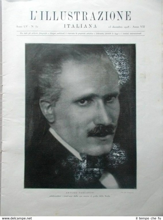 L'Illustrazione Italiana Rivista originale del 23 Dicembre 1928 Anno 55 - N. 52 Rarità per appassionati e collezionisti Segue sotto solamente un saggio del ricco contenuto presente Illustrato in copertina (segue foto): Arturo Toscanini e i suoi 30 anni dalla sua ascesa al podio della Scala Illustrazione presente nelle pagine interne (segue foto): Il "Parsifal" alla Scala di Milano Altra Illustrazione presente nelle pagine interne (segue foto): Arturo Toscanini dirige la marcia reale Tra gli argomenti trattati e le notizie contenute: La glorificazione di Roald Amundsen nell'anniversario della scoperta del polo antartico "Veni, soror mea." mistero sacro di Orio Vergani Il Natale svedese I presidenti delle sei grandi federazioni dei lavoratori italiani Il viaggio inaugurale della motonave "Vulcania" .e tanto altro ancora! Qualora vogliate maggiori delucidazioni contattateci. In questo negozio troverai un'intera categoria dedicata alla collezione dell'Illustrazione Italiana , ne inseriamo diverse giornalmente. Sotto il link diretto a tutta la collezione: Riviste disponibili Cliccaci sopra, troverai di certo ciò che cerchi! L'illustrazione Italiana è stata una rivista settimanale italiana con sede a Milano, pubblicata ininterrottamente dal 1873 al 1962 per un totale di quasi 5 000 numeri. Fondata a Milano con la testata «Nuova illustrazione universale», fu edita dalla casa editrice Fratelli Treves, fondata da Emilio Treves, il quale fu anche il primo direttore della rivista. L'illustrazione italiana comincia ad avere un'ampia diffusione negli ambienti della medio-alta borghesia, grazie alla qualità degli articoli e soprattutto delle illustrazioni, spesso affidate ad artisti di primo piano come Achille Beltrame, Pietro Scoppetta, Luigi Bompard, Giuseppe Cosenza ed Ettore Ximenes (il quale svolgeva anche le funzioni di vicedirettore), tale qualità fu mantenuta poi nel tempo anche in seguito all'avvento della fotografia, tecnica che vide rappresentati sulle pagine dell'«Illustrazione» alcuni tra i migliori fotogiornalisti nazionali: Armando Bruni, Mario Crimella, Giulio Parisio ed Emilio Sommariva. Per i testi il periodico si avvalse della collaborazione, in qualità di articolisti, di alcuni dei nomi più importanti della letteratura italiana, fra cui ricordiamo Giosuè Carducci, Grazia Deledda e Luigi Pirandello (premi Nobel per la letteratura), lo scrittore verista Giovanni Verga, il poeta Gabriele D'Annunzio, il critico letterario e favolista Luigi Capuana ed Edmondo De Amicis, autore del celeberrimo romanzo "Cuore", capolavoro della letteratura per ragazzi. La grande fortuna dell'Illustrazione Italiana durò fino alla morte di Emilio Treves (1916), dopo la quale, pur avendo ancora tra i propri collaboratori scrittori del calibro di Eugenio Montale, Elio Vittorini, Salvatore Quasimodo, Riccardo Bacchelli, Italo Pietra, Niccolò Giani e Sergio Solmi, la rivista cominciò a mostrare i segni di un lento declino. La promulgazione delle leggi razziali fasciste accelerò il processo in atto: nel 1939 la Treves dovette cedere l'azienda alla Garzanti. Verso la metà del 1942, in seguito agli eventi della seconda guerra mondiale, L'illustrazione rallentò le sue uscite, fino ad essere trasformata in mensile nel 1951 da Livio Garzanti. Gli anni cinquanta videro la crescita vertiginosa dei rotocalchi, settimanali popolari di attualità. «L'Illustrazione Italiana» vide ridursi progressivamente il suo spazio, finché Garzanti la chiuse nel 1962. L'editore Guanda riprese la testata alla fine del 1981 e la ripubblicò con periodicità bimestrale. Il tentativo non incontrò sufficiente fortuna e la rivista fu chiusa nel 1996. Paypal Carta di credito Bonifico bancario Spedizione con posta ordinaria o raccomandata scelta dall'Acquirente nel momento del pagamento Clicca qui per accedere al nostro Store ed al suo sterminato archivio