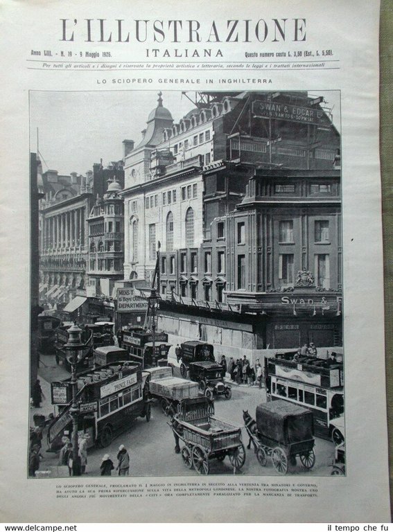 L'Illustrazione Italiana Rivista originale del 9 Maggio 1926 Anno 53 - N. 19 Rarità per appassionati e collezionisti Segue sotto solamente un saggio del ricco contenuto presente Illustrato in copertina (segue foto): Lo sciopero generale in Inghilterra Illustrazione presente nelle pagine interne (segue foto): La cattedrale di Taormina e la caratteristica fontana seicentesca Altra Illustrazione presente nelle pagine interne (segue foto): Per salvare la facciata della Scala Tra gli argomenti trattati e le notizie contenute: La morte del principe Vittorio Napoleone Teatri: "Santo Francesco" del maestro Mario Ferrigni La galleria di Giuseppe Chierichetti a Milano Nelle terre dei ghiacciai e dei fiordi Il terzo tomo di "Cose viste" di Ugo Ojetti Uomini e cose del giorno: Apelle vincitore del premio reale Il cinquantenario della società interna di mutuo soccorso La posizione dell'"Isola Fraschini" nell'industria italiana .e tanto altro ancora! Qualora vogliate maggiori delucidazioni contattateci. In questo negozio troverai un'intera categoria dedicata alla collezione dell'Illustrazione Italiana , ne inseriamo diverse giornalmente. Sotto il link diretto a tutta la collezione: Riviste disponibili Cliccaci sopra, troverai di certo ciò che cerchi! L'illustrazione Italiana è stata una rivista settimanale italiana con sede a Milano, pubblicata ininterrottamente dal 1873 al 1962 per un totale di quasi 5 000 numeri. Fondata a Milano con la testata «Nuova illustrazione universale», fu edita dalla casa editrice Fratelli Treves, fondata da Emilio Treves, il quale fu anche il primo direttore della rivista. L'illustrazione italiana comincia ad avere un'ampia diffusione negli ambienti della medio-alta borghesia, grazie alla qualità degli articoli e soprattutto delle illustrazioni, spesso affidate ad artisti di primo piano come Achille Beltrame, Pietro Scoppetta, Luigi Bompard, Giuseppe Cosenza ed Ettore Ximenes (il quale svolgeva anche le funzioni di vicedirettore), tale qualità fu mantenuta poi nel tempo anche in seguito all'avvento della fotografia, tecnica che vide rappresentati sulle pagine dell'«Illustrazione» alcuni tra i migliori fotogiornalisti nazionali: Armando Bruni, Mario Crimella, Giulio Parisio ed Emilio Sommariva. Per i testi il periodico si avvalse della collaborazione, in qualità di articolisti, di alcuni dei nomi più importanti della letteratura italiana, fra cui ricordiamo Giosuè Carducci, Grazia Deledda e Luigi Pirandello (premi Nobel per la letteratura), lo scrittore verista Giovanni Verga, il poeta Gabriele D'Annunzio, il critico letterario e favolista Luigi Capuana ed Edmondo De Amicis, autore del celeberrimo romanzo "Cuore", capolavoro della letteratura per ragazzi. La grande fortuna dell'Illustrazione Italiana durò fino alla morte di Emilio Treves (1916), dopo la quale, pur avendo ancora tra i propri collaboratori scrittori del calibro di Eugenio Montale, Elio Vittorini, Salvatore Quasimodo, Riccardo Bacchelli, Italo Pietra, Niccolò Giani e Sergio Solmi, la rivista cominciò a mostrare i segni di un lento declino. La promulgazione delle leggi razziali fasciste accelerò il processo in atto: nel 1939 la Treves dovette cedere l'azienda alla Garzanti. Verso la metà del 1942, in seguito agli eventi della seconda guerra mondiale, L'illustrazione rallentò le sue uscite, fino ad essere trasformata in mensile nel 1951 da Livio Garzanti. Gli anni cinquanta videro la crescita vertiginosa dei rotocalchi, settimanali popolari di attualità. «L'Illustrazione Italiana» vide ridursi progressivamente il suo spazio, finché Garzanti la chiuse nel 1962. L'editore Guanda riprese la testata alla fine del 1981 e la ripubblicò con periodicità bimestrale. Il tentativo non incontrò sufficiente fortuna e la rivista fu chiusa nel 1996. Paypal Carta di credito Bonifico bancario Spedizione con posta ordinaria o raccomandata scelta dall'Acquirente nel momento del pagamento