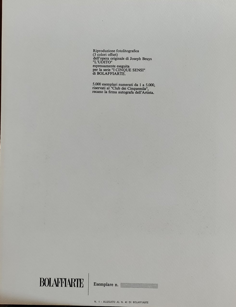 Riproduzione fotolitografica (3 colori offset) dell'opera originale di Joseph Beuys espressamente eseguita per la serie "I CINQUE SENSI" di BOLLAFFIARTE