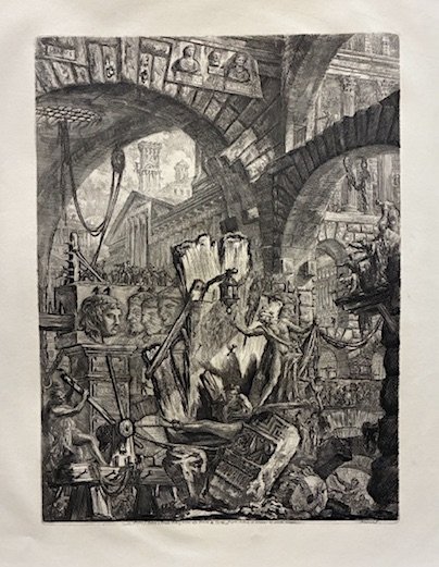 Acquaforte originale (cm. 41,5x56 più ampi margini bianchi) tratta dall’edizione delle ‘Carceri d’invenzione’ stampata da Firmin-Didot tra il 1835 ed il 1839. Esemplare in eccellente stato di conservazione. Tavola II cui fu aggiunto dall’editore francese il numero arabo 350. Secondo stato di due (il primo fu pubblicato da Piranesi stesso nel 1760). Firma in basso a destra ‘Piranesi F.’. Cfr. Focillon, p. 13; Hind, p. 25; Wilton-Ely I, p. 51.