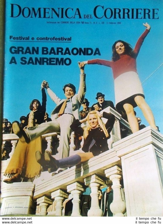 La Domenica del Corriere Rivista originale del 11 Febbraio 1969 Anno 71 - N. 6 Rarità per appassionati e collezionisti Seguono solo alcuni dei fatti descritti, illustrati e fotografati all'interno Illustrato in copertina (segue foto): Festival e controfestival: gran baraonda a Sanremo. Illustrato nelle ultime pagine (segue foto): Jacovitti: Popjac - Giuseppe. Nelle pagine interne: Morto Allen Dulles, l'uomo che salvò Parri dai nazisti. Mosca sfrutta la morte di Palach. Montanelli: l'insegnamento di Palach. Pronti a partire i volontari civili. Vento di rinnovamento e di tempesta: le tentazioni della Chiesa. La Francia scossa dal giallo di Alain Delon. Le case dei divi preferite dai ladri. La fabbrica dell'universo (3^ puntata): il respiro del cosmo. L'alleanza atlantica compie 20 anni: la Nato ha fatto i conti in tasca ai sovietici. A 20 anni dalla morte di Gandhi bilancio della non-violenza nel mondo. .e tanto altro ancora! Qualora vogliate maggiori delucidazioni contattateci In questo negozio troverai un'intera categoria dedicata alla collezione delle Domeniche del Corriere, ne inseriamo diverse giornalmente e a breve saranno presenti tutte le riviste dei 90 anni in cui sono avvenute le pubblicazioni Sotto il link diretto alla collezione: Riviste disponibili Cliccaci sopra, troverai di certo ciò che cerchi! La Domenica del Corriere è stato un popolare settimanale italiano fondato a Milano nel 1899 e chiuso nel 1989. Fortemente voluto da Luigi Albertini, allora direttore amministrativo del Corriere della Sera, apparve per la prima volta nelle edicole l'8 gennaio 1899 come supplemento illustrato del Corriere della Sera. Stampata in grande formato (sul modello del domenicale La Tribuna illustrata), aveva 12 pagine e veniva distribuita gratis agli abbonati del Corriere, oppure si poteva acquistare in edicola per 10 centesimi. Non fu concepito come periodico di informazione, per non risultare un doppione del quotidiano. Venne pensato come «settimanale degli italiani». Doveva scandire, come un calendario, le loro giornate liete, le loro tragedie, i loro fatti piccoli e grandi. La prima e ultima di copertina erano sempre disegnate. Il Corriere si avvaleva di un giovane disegnatore, Achille Beltrame, allora sconosciuto, a cui veniva affidato in ogni numero il compito di rendere con la sua tavola il fatto più interessante della settimana. La prima delle tavole a colori con cui Beltrame raccontò ogni settimana, per oltre quarant'anni, le vicende del suo tempo, si riferiva ad una tempesta di neve nel Montenegro (1899). Il Montenegro era salito da poco agli onori della cronaca poiché Vittorio Emanuele di Savoia l'erede al trono d'Italia, si era appena sposato con Elena di Montenegro. Le tavole a colori di Beltrame divennero il marchio distintivo della rivista. Nelle sue copertine è riassunta in pratica tutta la storia del costume e della società italiana della prima metà del XX secolo. Fatti di cronaca, sportivi, di costume venivano riassunti con maestria dall'illustratore arzignanese, che riusciva a renderli vivi e attuali agli occhi di una popolazione non ancora del tutto uscita dall'analfabetismo. Non si mosse mai da Milano dove disegnò tutte le sue tavole. Ciò nonostante riuscì a rappresentare luoghi, fatti, persone e cose che non aveva mai visto di persona, grazie alla sua innata immaginazione e curiosità unite ad un rigoroso senso di realismo. Celebri, in particolare, furono le sue illustrazioni degli avvenimenti bellici della Grande guerra e delle vicende degli Alpini. Dopo la sua morte nel 1945, fu sostituito da Walter Molino che, come il suo predecessore, firmò memorabili copertine andando avanti per trent'anni. Fra le più celebri, quella sulla nascita della televisione (1954), del campione ciclista Fausto Coppi (1960), i russi nello spazio (1965). A differenza dei settimanali dell'epoca, la Domenica del Corriere diede ampio spazio alle fotografie e ai disegni, e questo fu uno dei motivi del suo successo. Nel corso degli anni venti e trenta, il periodico divenne uno dei principali strumenti di informazione non solo della borghesia colta ma di buona parte della popolazione italiana alfabetizzata. In questo periodo divenne il settimanale più venduto in Italia: le vendite raggiunsero le 600.000 copie. Sulle pagine della Domenica del Corriere trovarono una vetrina popolare anche le grandi firme del Corriere, da Luigi Barzini a Indro Montanelli. Montanelli fu il primo direttore dopo la fine della guerra e lasciò la direzione alla fine del 1946 per tornare al Corriere della Sera. Dopo Montanelli cominciò la lunghissima direzione di Eligio Possenti, critico teatrale, che guidò la Domenica fino al 1964, coadiuvato dal direttore "ombra", lo scrittore Dino Buzzati. Per tutti gli anni cinquanta La Domenica fu in testa alle vendite dei settimanali con 950.000 copie (con un picco di 1.300.000 nel 1952-53), seguita da Oggi con 650.000. Dopo un periodo di appannamento agli inizi degli anni sessanta, dovuto al diffondersi