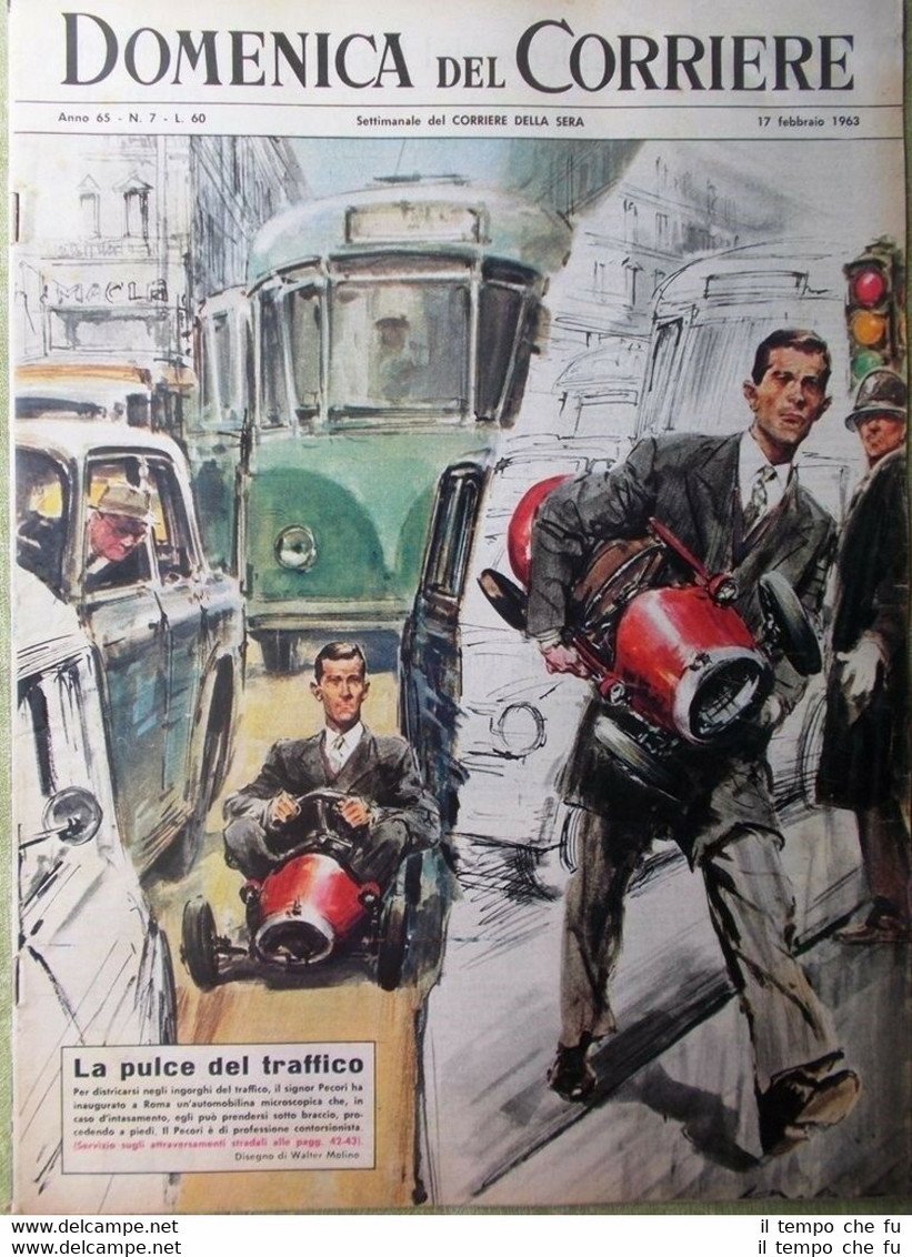 La Domenica del Corriere Rivista originale del 17 Febbraio 1963 Anno 65 - N. 7 Rarità per appassionati e collezionisti Seguono solo alcuni dei fatti descritti, illustrati e fotografati all'interno Illustrato in copertina (segue foto): Per districarsi negli ingorghi del traffico, il signor Pecori ha inaugurato a Roma un'automobilina microscopica che, in caso di intasamento, egli può prendersi sotto braccio, procedendo a piedi. Il Pecori è di professione contorsionista. Illustrato nella retro copertina (segue foto): Nei pressi di un villaggio del Vietnam un giovanotto con abile manovra è riuscito ad uccidere una gigantesca tigre a coltellate. Nelle pagine interne: Morto Learco Guerra, la leggendaria "locomotiva umana" del ciclismo. Tito parlando di Mao Tse-Tung dice: non è Marx ma Gengis Khan che ispira i comunisti cinesi. Gli vanno bene le scarpe del grande papà. Questo è l'unico ricordo che Sandrino Mazzola conservi del famosissimo padre. Ecco i campioni dell' intellighenzia sovietica. Perché non ci sanno fare i nostri dongiovanni con le ragazze svedesi. .e tanto altro ancora! Qualora vogliate maggiori delucidazioni contattateci In questo negozio troverai un'intera categoria dedicata alla collezione delle Domeniche del Corriere, ne inseriamo diverse giornalmente e a breve saranno presenti tutte le riviste dei 90 anni in cui sono avvenute le pubblicazioni Sotto il link diretto alla collezione: Riviste disponibili Cliccaci sopra, troverai di certo ciò che cerchi! La Domenica del Corriere è stato un popolare settimanale italiano fondato a Milano nel 1899 e chiuso nel 1989. Fortemente voluto da Luigi Albertini, allora direttore amministrativo del Corriere della Sera, apparve per la prima volta nelle edicole l'8 gennaio 1899 come supplemento illustrato del Corriere della Sera. Stampata in grande formato (sul modello del domenicale La Tribuna illustrata), aveva 12 pagine e veniva distribuita gratis agli abbonati del Corriere, oppure si poteva acquistare in edicola per 10 centesimi. Non fu concepito come periodico di informazione, per non risultare un doppione del quotidiano. Venne pensato come «settimanale degli italiani». Doveva scandire, come un calendario, le loro giornate liete, le loro tragedie, i loro fatti piccoli e grandi. La prima e ultima di copertina erano sempre disegnate. Il Corriere si avvaleva di un giovane disegnatore, Achille Beltrame, allora sconosciuto, a cui veniva affidato in ogni numero il compito di rendere con la sua tavola il fatto più interessante della settimana. La prima delle tavole a colori con cui Beltrame raccontò ogni settimana, per oltre quarant'anni, le vicende del suo tempo, si riferiva ad una tempesta di neve nel Montenegro (1899). Il Montenegro era salito da poco agli onori della cronaca poiché Vittorio Emanuele di Savoia l'erede al trono d'Italia, si era appena sposato con Elena di Montenegro. Le tavole a colori di Beltrame divennero il marchio distintivo della rivista. Nelle sue copertine è riassunta in pratica tutta la storia del costume e della società italiana della prima metà del XX secolo. Fatti di cronaca, sportivi, di costume venivano riassunti con maestria dall'illustratore arzignanese, che riusciva a renderli vivi e attuali agli occhi di una popolazione non ancora del tutto uscita dall'analfabetismo. Non si mosse mai da Milano dove disegnò tutte le sue tavole. Ciò nonostante riuscì a rappresentare luoghi, fatti, persone e cose che non aveva mai visto di persona, grazie alla sua innata immaginazione e curiosità unite ad un rigoroso senso di realismo. Celebri, in particolare, furono le sue illustrazioni degli avvenimenti bellici della Grande guerra e delle vicende degli Alpini. Dopo la sua morte nel 1945, fu sostituito da Walter Molino che, come il suo predecessore, firmò memorabili copertine andando avanti per trent'anni. Fra le più celebri, quella sulla nascita della televisione (1954), del campione ciclista Fausto Coppi (1960), i russi nello spazio (1965). A differenza dei settimanali dell'epoca, la Domenica del Corriere diede ampio spazio alle fotografie e ai disegni, e questo fu uno dei motivi del suo successo. Nel corso degli anni venti e trenta, il periodico divenne uno dei principali strumenti di informazione non solo della borghesia colta ma di buona parte della popolazione italiana alfabetizzata. In questo periodo divenne il settimanale più venduto in Italia: le vendite raggiunsero le 600.000 copie. Sulle pagine della Domenica del Corriere trovarono una vetrina popolare anche le grandi firme del Corriere, da Luigi Barzini a Indro Montanelli. Montanelli fu il primo direttore dopo la fine della guerra e lasciò la direzione alla fine del 1946 per tornare al Corriere della Sera. Dopo Montanelli cominciò la lunghissima direzione di Eligio Possenti, critico teatrale, che guidò la Domenica fino al 1964, coadiuvato dal direttore "ombra", lo scrittore Dino Buzzati. Per tutti gli anni cinquanta La Domenica fu in testa alle vendite dei settimanali con 950.000 copie