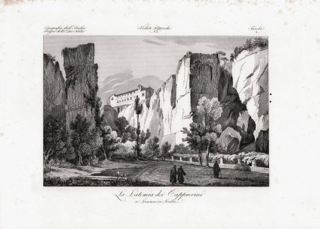 Veduta pubblicata nel noto ' Atlante illustrativo, ossia Raccolta dei principali monumenti italiani antichi, del Medio evo e moderni, e di alcune vedute pittoriche… ' di Attilio Zuccagni-Orlandini, edito in 3 tomi nel 1845 a Firenze, per servire di corredo alla ' Corografia fisica, storica e statistica dell'Italia…, opera in 12 volumi, pubblicati dal 1837 al 1845, corredata - oltre che dall'Atlante illustrativo ' sopra descritto - anche da un ' Atlante geografico degli Stati italiani, ' in due tomi. Attilio Zuccagni Orlandini (1784-1872) nacque a Fiesole con il nome di Giuseppe Orlandini. In seguito all’adozione da parte del facoltoso zio materno Attilio Zuccagni (1754-1807), botanico e georgofilo, assunse il nome di Attilio Zuccagni Orlandini. La sua più importante opera è la relazione geografico-cartografica di tutti gli Stati preunitari italiani, la grandiosa ' Corografia fisica, storica e statistica dell’Italia e delle sue Isole ' (Firenze 1835-1845), in dodici volumi per diciannove tomi, con un volume introduttivo sull’intera penisola italiana. L’opera costituì la summa delle centinaia di opere geografiche generali, regionali e locali allora disponibili e presentava, per ogni Stato preunitario, la trattazione fisica, storica, topografica e un inquadramento statistico. Nel 1844-45, la ' Corografia ' fu arricchita con cinque volumi di cartografie, vedute e altre illustrazioni di luoghi e monumenti: ' Atlante geografico degli Stati italiani delineato sopra le migliori e più moderne mappe ' (due volumi con 144 tavole inclusa la grande carta della penisola in 15 fogli) e ' Atlante illustrativo ossia raccolta dei principali monumenti italiani antichi, del medio evo e moderni e di alcune vedute pittoriche ' (tre volumi con 413 illustrazioni, stampate su 269 fogli). Le tavole furono incise, sempre a Firenze, in due apposite officine, da quattro valenti artisti lombardi (Vittorio Angeli, Giacinto Maina, Pietro Manzoni e Giuseppe Pozzi). Soprattutto il primo dei due atlanti rappresenta, ancora oggi, una pietra miliare nella storia della cartografia e dell’iconografia geografica italiana. Fu veramente ‘un’ardua impresa’, dal momento che spesso mancavano ancora (come, ad esempio, per il ' Ducato di Lucca ' e lo ' Stato Pontificio) prodotti cartografici compiutamente geometrici. I due prodotti furono presentati ai Georgofili nel 1843 e nel 1844, insieme alla mappa della Repubblica di San Marino. L’opera si rivelò oltremodo costosa e non ottenne il successo commerciale sperato, ma servì da base per tante altre iniziative editoriali successive che vi attinsero, talora senza neppure rispettarne i diritti d’autore. ' Incisione su rame all'acquaforte, in ottimo stato di conservazione. ' Bibliografia: Anna Guarducci - ' Dizionario Biografico degli Italiani ' - Volume 100 (2020). View published in the famous ' Atlante illustrativo, ossia Raccolta dei principali monumenti italiani antichi, del Medio evo e moderni, e di alcune vedute pittoriche. di Attilio Zuccagni-Orlandini, published in 3 volumes in Florence, 1845, to accompany the ' Corografia fisica, storica e statistica dell'Italia., a work in 12 volumes, published from 1837 to 1845, accompanied - in addition to the Atlante illustrativo described above - also by a ' Atlante geografico degli Stati italiani, in two volumes. Attilio Zuccagni Orlandini (1784-1872) was born in Fiesole under the name of Giuseppe Orlandini. Following adoption by his wealthy maternal uncle Attilio Zuccagni (1754-1807), a botanist and georgofile, he took the name Attilio Zuccagni Orlandini. His most important work is the geographic-cartographic report of all the pre-unification Italian states, the great ' Corografia fisica, storica e statistica dell'Italia e delle sue Isole ' (Florence 1835-1845), in twelve volumes for nineteen tomes, with an introductory volume on the entire Italian peninsula. The work constituted the sum of hundreds of general, regional and local geographic works then available and presented, for each pre-unification state, the physical, historical, topographical and statistical framework. In 1844-45, the ' Corografia ' was enriched with five volumes of maps, views and other illustrations of places and monuments: ' Atlante geografico degli Stati italiani delineato sopra le migliori e più moderne mappe ' (two volumes with 144 plates including the large map of the peninsula in 15 sheets) and ' Atlante illustrativo ossia raccolta dei principali monumenti italiani antichi, del medio evo e moderni e di alcune vedute pittoriche ' (three volumes with 413 illustrations, printed on 269 sheets). The plates were engraved, again in Florence, in two special workshops, by four talented Lombard artists (Vittorio Angeli, Giacinto Maina, Pietro Manzoni and Giuseppe Pozzi). Especially the first of the two atlases represents, even today, a milestone in the history of cartography and Italian geographic iconography. It was truly 'an arduous undertaking', since cartographic products were often still lacking (as, for example, for the Duchy of Lucca and the Papal States) fully geometric. The two products were presented to the Georgofili in 1843 and 1844, along with the map of the Republic of San Marino. The work proved to be very expensive and did not achieve the commercial success hoped for, but served as a basis for many other subsequent publishing initiatives that drew on it, sometimes without even respecting the copyright. ' Etching, in excellent condition. ' Literature: Anna Guarducci - ' Dizionario Biografico degli Italiani ' - Volume 100 (2020). Cfr.
