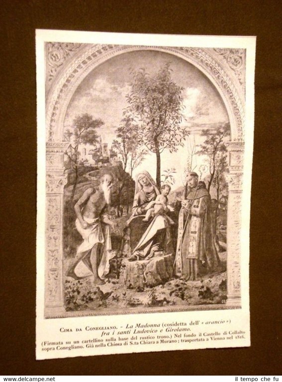 Rara stampa Estratta da Rivista d'epoca del 1923 . .stampa che ha quindi oltre 92 anni! La Madonna dell'arancio tra San Ludovico e San Girolamo Cima Da Conegliano II1923-028 Dimensioni Cm 12,00 x 17,00 Qualora vogliate delle scansioni migliori contattateci, soddisferemo ogni vostra richiesta. PaypalCarta di creditoBonifico bancario Accuratamente adagiate su un cartoncino e protette da pellicola trasparente rigida,il tutto viene inserito dentro plico di adeguate dimensioni per proteggerne l'integrità.