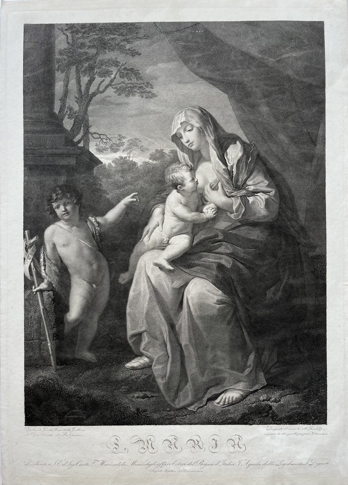 La stampa riproduce un celebre dipinto di Guido Reni conservato a Bologna nella collezione Tanari ed oggi perduto. Un disegno preparatorio per il dipinto di Reni, è conservato presso La Royal Collection. Oltre l'immagine, nel margine bianco: S Maria quadro di Guido Reni della galleria di casa Tanari disegnato e inciso da M.o Gandolfi né prima da altri per disposizione testamentaria dedicato a S.E. sig.r conte F. Mrescalchi minis.ro degli affari esteri del regno d'Italia g.and aquila della leg.on d'onore g.an dign.o etc re.to alla prefettura del Reno nel 1812. La matrice di rame è stata biffata probabilmente dallo stesso Gandolfi tagliandola in orizzontale e graffiando i volti. Secondo Davoli perché male accolta dalla critica o per limitarne la circolazione dato l'accordo con la famiglia Tanari.