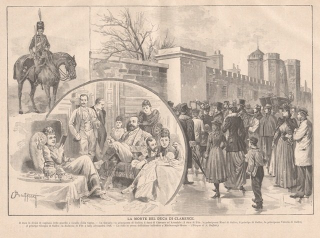 In alto a sx il principe Alberto Vittorio, duca di Clarence e Avondale, in divisa; nel tondo il duca e la sua famiglia; a dx la folla che attende il bollettino sulle condizioni di salute del duca a Marlborough - House. Testo al retro