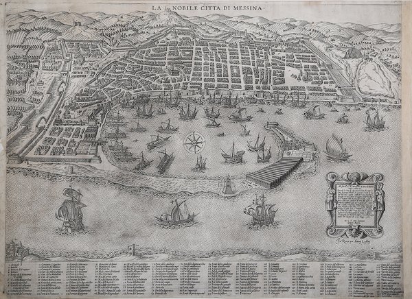 mostrando di qu?[n]to più ho possuto per i numeri tutti i Castelli, Forti, Fonte, Strade, Piazze, Chiese, Conuenti, Monasteri, & altri lochi . La pianta è dedicata dallautore al nobile siciliano Pietro de Luna e Salviati (1520-1575), primo Duca di Bivona, a cui, anche in virtù del suo propizio matrimonio con la figlia del viceré di Sicilia, Giovanni de Vega, era stato recentemente conferito questo titolo da Carlo V, Re di Spagna, Re dItalia, Arciduca dAustria e Imperatore del S.R.I. Germanico. La carta è presente nellinventario della tipografia Lafreri (n. 147) indicata semplicemente come Messina; non risulta, invece, nellinventario di Stefano Duchetti ed è quindi plausibile che la lastra fu in possesso di Claudio Duchetti. Sono note anche le tirature di Orlandi e Van Schoel; questultima reca limmagine della Vergine aggiunta in alto a destra e solo 166 rimandi nella legenda.Stati & edizioni: 1°: come descritto, con indirizzo In Roma per Antonj Lafrerj. Legenda in basso stampata con caratteri tipografici.2°: sempre con indirizzo In Roma per Antonj Lafrerj. Legenda in basso incisa sulla lastra.3°: aggiunto lindirizzo Ioannes Orladi formis romae 1602.4°: il nome di Orlandi sostituito da Henricus va Schoel formis romae. Rappresentazione della Vergine in alto a destra.Bibliografia: a) Alberti (2010): n. Second state, published in the same year of the first one,1567 and by the same publisher, Antonio Lafreri. In this edition, the text is also engraved (first edition with typographic text).Etching and engraving. This perspective plan is the first overall image of Messina. It's also the first one to shows the New Arsenals, built on the arm of St. Ranieri in 1565 - Arcenale Novo fate L anno 1565. The design is very accurate and detailed: besides the rendering of the buildings that's very realistic, there are many kind of ships. At the bottom of the image, is also shown the coast of Calabria.Decorative cartouche containing descriptive text. Compass rose. North oriented toward right of sheet. Shows topography, vegetation, buildings, roads.At the bottom, a key of 167 notable places or buildings. At bottom right the dedication to Pietro de Luna e Salviati (1520-1575), first Duke of Bivona.Literature: Benevolo (1969): pp. 70-71, tav. XI; Mostra Bergamo (2016): n. 74; Rubach (2016): n. 232; Tooley (1939): n. 388; Tooley (1983): n. 388d;Known examples: 1°: Parigi, Bibliothèque Nationale; Roma, Biblioteca Nazionale; Roma, Istituto Centrale per la Grafica. 2°: Atlante Stevens-Beans-Nebenzahl; Chicago, Newberry Library; Firenze, Biblioteca Nazionale (3); Londra, British Library; Londra, Royal Geographical Society; Madrid, Real Biblioteca; Milano, Raccolta Bertarelli; Parigi, Bibliothèque Nationale; Roma, Biblioteca Nazionale (2); Roma, Casanatense; Sint-Niklaas, Kowk; Stanford, University Library; Stoccarda, Württembergische Landesbibliothek; Torino, Archivio di Stato; Washington, Library of Congress; Yale, University Library. 3°: Fano, Federiciana; Parigi, Bibliothèque Nationale. 4°: Malta, National Library; Roma, Istituto Centrale per la Grafica.