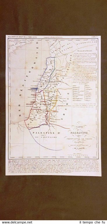 Rara carta geografica o mappa del 1859. Stampata su carta non retroscritta .Stampa che ha quindi oltre 161 anni! La Palestina durante il Regno di Costantino I Anno 330 D.C. Stampata sotto la direzione di A. Houzé Molto dettagliata, con confini colorati e con ampia didascalia Codice articolo: VIP-044 Dimensioni: Cm 21,00 x 31,00 Estratta dalla pregiata e rara opera "Universite de France - Atlas Universel Historique et Géographique", edita in Parigi nel 1859 da A. Houzé, membro della Società di geografia. Paypal Carta di credito Bonifico bancario Spedizione con posta ordinaria o raccomandata scelta dall'Acquirente nel momento del pagamento Clicca qui per accedere al nostro Store ed al suo sterminato archivio