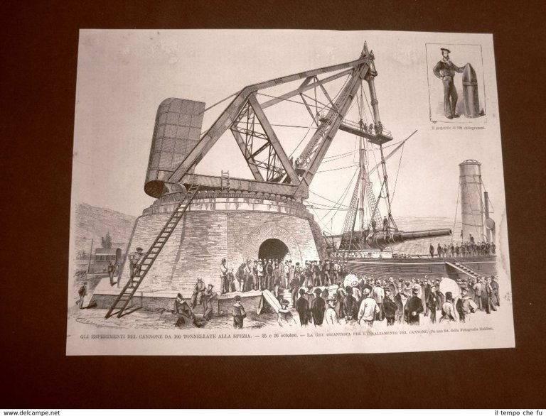 La Spezia nel 1876 Gru gigantesca innalza il cannone da 100 per gli esperimenti | Stampe |