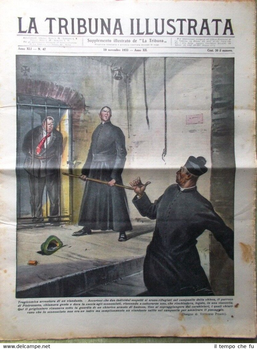La Tribuna Illustrata Rivista originale del 19 Novembre 1933 Anno 41 - N. 47 Rarità per appassionati e collezionisti Seguono solo alcuni dei fatti descritti, illustrati e fotografati all'interno Illustrato in copertina (segue foto): Accortosi che due individui sospetti si erano rifugiati sul campanile della chiesa, il parroco di Pietrasanta, chiamava gente e dava caccia agli sconosciuti, riuscendo a catturarne uno e tenendolo prigioniero finché arrivavano i carabinieri per scoprire che lo sconosciuto era solo un viandante (disegno di Vittorio Pisani) Illustrato nella retro copertina (segue foto): A Sissa (Parma) durante la cerimonia inaugurativa delle scuole elementari, con l'intervento di Giovani Fascisti di tutta la provincia, il giovane Ludovico Cugini, visto sopraggiungere un cavallo imbizzarrito lo affrontava coraggiosamente e riusciva a fermarlo dopo grandi e pericolosi sforzi (disegno di Vittorio Pisani) Nelle pagine interne: Il Re consegna la medaglia d'oro all'arma di cavalleria. Roma 2000 anni fa: battaglie a colpi di sesterzi. Esistono montagne più alte dell'Everest ? Campionario di eleganze. Atlantide è stata trovata? .e tanto altro ancora! Qualora vogliate maggiori delucidazioni contattateci In questo negozio troverai un'intera categoria dedicata alle Tribune Illustrate, sotto il link diretto alla collezione: Riviste disponibili Cliccaci sopra, troverai di certo ciò che cerchi! La Tribuna Illustrata fu un settimanale italiano pubblicato a Roma. Insieme a La Domenica del Corriere e a L'Illustrazione Italiana fu il settimanale illustrato preferito dagli Italiani nel periodo che intercorse dalla fine dell'800 all'avvento della televisione. Fondato nel 1890 come supplemento del quotidiano La Tribuna, il primo numero uscì il 6 gennaio, il formato della rivista era cm 27 x 38, un formato poco più grande del tabloid. La prima ed ultima pagina erano a colori, disegnate da pittori e incisori affermati. Ogni numero conteneva 16 pagine. I principali collaboratori furono: Luigi Capuana, Adolfo De Bosis, Alfredo Fabrizi, Gandolin, Giuseppe Giacosa, Attilio Luzzato, Enrico Panzacchi, Rastignac, Attilio Sarfatti, Armand Silvestre, Ettore Socci, Gaspare Ungarelli, Pio Vanzi, Annie Vivanti. Il Corredo iconografico fu di prim'ordine. I principali pittori, disegnatori ed illustratori furono: Basilio Cascella e i figli Tommaso e Michele, Enrico Lionne, Aleardo Terzi, Augusto Bompiani, Roberto Bompiani, Domenico Bruschi, Modesto Faustini, Rubens Santoro, Rafael Senet, Cesare Tiratelli. Tra i romanzi a puntate che vi uscirono ricordiamo: L'invincibile, di Gabriele D'Annunzio Una giovinezza, di Francois Coppée e Zia Aurelia di André Theuriet, questi ultimi due entrambi illustrati da Emile Bayard. Paypal Carta di credito Bonifico bancario Spedizione con posta prioritaria o raccomandata scelta dall'acquirente nel momento del pagamento