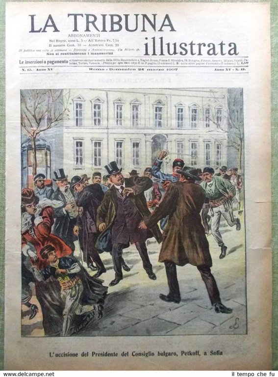 La Tribuna Illustrata Rivista originale del 24 Marzo 1907 Anno 15 - N. 12 Rarità per appassionati e collezionisti Seguono solo alcuni dei fatti descritti, illustrati e fotografati all'interno Illustrato in copertina (segue foto): L'uccisione del Presidente del Consiglio bulgaro, Petkoff a Sofia Illustrato nella retro copertina (segue foto): Il paese di Borsano distrutto dall'incendio Nelle pagine interne: Parigi al buio. La scoperta di una Niobide nei giardini sallustiani. Un torneo di Lawn-Tennis a Napoli. Il comico Edoardo Ferravilla. Veduta di Borsano dopo l'incendio. L'esplosione della corazzata francese "Jena" nell'arsenale di Tolone. .e tanto altro ancora! Qualora vogliate maggiori delucidazioni contattateci In questo negozio troverai un'intera categoria dedicata alle Tribune Illustrate, sotto il link diretto alla collezione: Riviste disponibili Cliccaci sopra, troverai di certo ciò che cerchi! La Tribuna Illustrata fu un settimanale italiano pubblicato a Roma. Insieme a La Domenica del Corriere e a L'Illustrazione Italiana fu il settimanale illustrato preferito dagli Italiani nel periodo che intercorse dalla fine dell'800 all'avvento della televisione. Fondato nel 1890 come supplemento del quotidiano La Tribuna, il primo numero uscì il 6 gennaio, il formato della rivista era cm 27 x 38, un formato poco più grande del tabloid. La prima ed ultima pagina erano a colori, disegnate da pittori e incisori affermati. Ogni numero conteneva 16 pagine. I principali collaboratori furono: Luigi Capuana, Adolfo De Bosis, Alfredo Fabrizi, Gandolin, Giuseppe Giacosa, Attilio Luzzato, Enrico Panzacchi, Rastignac, Attilio Sarfatti, Armand Silvestre, Ettore Socci, Gaspare Ungarelli, Pio Vanzi, Annie Vivanti. Il Corredo iconografico fu di prim'ordine. I principali pittori, disegnatori ed illustratori furono: Basilio Cascella e i figli Tommaso e Michele, Enrico Lionne, Aleardo Terzi, Augusto Bompiani, Roberto Bompiani, Domenico Bruschi, Modesto Faustini, Rubens Santoro, Rafael Senet, Cesare Tiratelli. Tra i romanzi a puntate che vi uscirono ricordiamo: L'invincibile, di Gabriele D'Annunzio Una giovinezza, di Francois Coppée e Zia Aurelia di André Theuriet, questi ultimi due entrambi illustrati da Emile Bayard. Paypal Carta di credito Bonifico bancario Spedizione con posta prioritaria o raccomandata scelta dall'acquirente nel momento del pagamento
