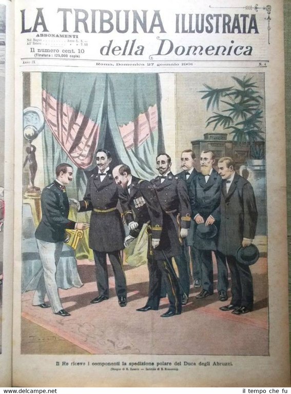 La Tribuna Illustrata Rivista originale del 27 Gennaio 1901 Anno 9 - N. 4 Rarità per appassionati e collezionisti Seguono solo alcuni dei fatti descritti, illustrati e fotografati all'interno Illustrato in copertina (segue foto): Il Re riceve i componenti la spedizione polare del Duca degli Abruzzi (disegno di Zanetti) Illustrato nella retro copertina (segue foto): La defunta Regina d'Inghilterra e i suoi tre diretti discendenti (disegno di Zanetti) Nelle pagine interne: Un uomo senza braccia. La morte di Vittoria d'Inghilterra. Il conte Pietro Antonelli. La morte del pittore Arnold Bocklin. .e tanto altro ancora! Qualora vogliate maggiori delucidazioni contattateci In questo negozio troverai un'intera categoria dedicata alle Tribune Illustrate, sotto il link diretto alla collezione: Riviste disponibili Cliccaci sopra, troverai di certo ciò che cerchi! La Tribuna Illustrata fu un settimanale italiano pubblicato a Roma. Insieme a La Domenica del Corriere e a L'Illustrazione Italiana fu il settimanale illustrato preferito dagli Italiani nel periodo che intercorse dalla fine dell'800 all'avvento della televisione. Fondato nel 1890 come supplemento del quotidiano La Tribuna, il primo numero uscì il 6 gennaio, il formato della rivista era cm 27 x 38, un formato poco più grande del tabloid. La prima ed ultima pagina erano a colori, disegnate da pittori e incisori affermati. Ogni numero conteneva 16 pagine. I principali collaboratori furono: Luigi Capuana, Adolfo De Bosis, Alfredo Fabrizi, Gandolin, Giuseppe Giacosa, Attilio Luzzato, Enrico Panzacchi, Rastignac, Attilio Sarfatti, Armand Silvestre, Ettore Socci, Gaspare Ungarelli, Pio Vanzi, Annie Vivanti. Il Corredo iconografico fu di prim'ordine. I principali pittori, disegnatori ed illustratori furono: Basilio Cascella e i figli Tommaso e Michele, Enrico Lionne, Aleardo Terzi, Augusto Bompiani, Roberto Bompiani, Domenico Bruschi, Modesto Faustini, Rubens Santoro, Rafael Senet, Cesare Tiratelli. Tra i romanzi a puntate che vi uscirono ricordiamo: L'invincibile, di Gabriele D'Annunzio Una giovinezza, di Francois Coppée e Zia Aurelia di André Theuriet, questi ultimi due entrambi illustrati da Emile Bayard. Paypal Carta di credito Bonifico bancario Spedizione con posta prioritaria o raccomandata scelta dall'acquirente nel momento del pagamento