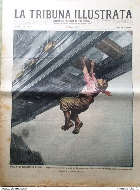 La Tribuna Illustrata Rivista originale del 27 Marzo 1927 Anno 35 - N. 13 Rarità per appassionati e collezionisti Seguono solo alcuni dei fatti descritti, illustrati e fotografati all'interno Illustrato in copertina (segue foto): Tra due terribili morti (disegno di Vittorio Pisani) Illustrato nella retro copertina (segue foto): In un circo di Eberfield, nella Westfalia, una cicogna ammaestrata è entrata nella gabbia dei leoni e ha cominciato a beccare il più grosso di questi. Il domatore fece in tempo a far uscire i leoni uno a uno lasciando nella gabbia il pennuto (disegno di Vittorio Pisani) Nelle pagine interne: Gli orchi delle favole non erano una favola. Le esercitazioni di bombardamento aereo al Balipedio di Furbara. Un ritratto di Pietro Mascagni. Il più grande motore del mondo costruito dallo Stabilimento Tecnico Triestino per il transatlantico Saturnia. Il re del jazz Paul Whiteman ha acquistato un nuovo titolo nobiliare. Il famoso maresciallo Cian-So-Lin. .e tanto altro ancora! Qualora vogliate maggiori delucidazioni contattateci In questo negozio troverai un'intera categoria dedicata alle Tribune Illustrate, sotto il link diretto alla collezione: Riviste disponibili Cliccaci sopra, troverai di certo ciò che cerchi! La Tribuna Illustrata fu un settimanale italiano pubblicato a Roma. Insieme a La Domenica del Corriere e a L'Illustrazione Italiana fu il settimanale illustrato preferito dagli Italiani nel periodo che intercorse dalla fine dell'800 all'avvento della televisione. Fondato nel 1890 come supplemento del quotidiano La Tribuna, il primo numero uscì il 6 gennaio, il formato della rivista era cm 27 x 38, un formato poco più grande del tabloid. La prima ed ultima pagina erano a colori, disegnate da pittori e incisori affermati. Ogni numero conteneva 16 pagine. I principali collaboratori furono: Luigi Capuana, Adolfo De Bosis, Alfredo Fabrizi, Gandolin, Giuseppe Giacosa, Attilio Luzzato, Enrico Panzacchi, Rastignac, Attilio Sarfatti, Armand Silvestre, Ettore Socci, Gaspare Ungarelli, Pio Vanzi, Annie Vivanti. Il Corredo iconografico fu di prim'ordine. I principali pittori, disegnatori ed illustratori furono: Basilio Cascella e i figli Tommaso e Michele, Enrico Lionne, Aleardo Terzi, Augusto Bompiani, Roberto Bompiani, Domenico Bruschi, Modesto Faustini, Rubens Santoro, Rafael Senet, Cesare Tiratelli. Tra i romanzi a puntate che vi uscirono ricordiamo: L'invincibile, di Gabriele D'Annunzio Una giovinezza, di Francois Coppée e Zia Aurelia di André Theuriet, questi ultimi due entrambi illustrati da Emile Bayard. Paypal Carta di credito Bonifico bancario Spedizione con posta prioritaria o raccomandata scelta dall'acquirente nel momento del pagamento