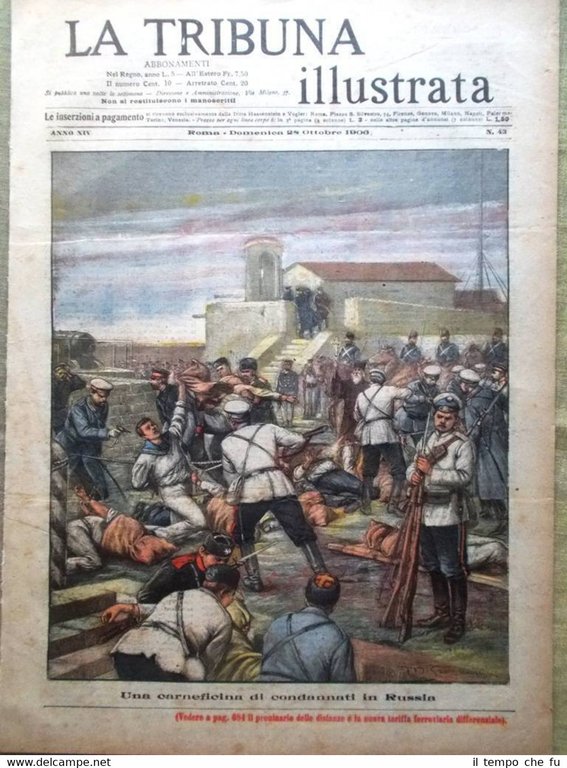 La Tribuna Illustrata Rivista originale del 28 Ottobre 1906 Anno 14 - N. 43 Rarità per appassionati e collezionisti Seguono solo alcuni dei fatti descritti, illustrati e fotografati all'interno Illustrato in copertina (segue foto): Una carneficina di condannati in Russia Illustrato nella retro copertina (segue foto): Un tragico episodio del nubifragio di Torre del Greco Nelle pagine interne: La città di Camerino a Francesco Vitalini. La regina Margherita a Parigi. Il disastro di Epernon. Le carte da gioco. I raggi X contro le canizie. Sulle sponde dell'Averno: la grotta della Sibilla, il tempio di Venere, il tempio di Nettuno. Rivelazioni sul pianeta Marte. .e tanto altro ancora! Qualora vogliate maggiori delucidazioni contattateci In questo negozio troverai un'intera categoria dedicata alle Tribune Illustrate, sotto il link diretto alla collezione: Riviste disponibili Cliccaci sopra, troverai di certo ciò che cerchi! La Tribuna Illustrata fu un settimanale italiano pubblicato a Roma. Insieme a La Domenica del Corriere e a L'Illustrazione Italiana fu il settimanale illustrato preferito dagli Italiani nel periodo che intercorse dalla fine dell'800 all'avvento della televisione. Fondato nel 1890 come supplemento del quotidiano La Tribuna, il primo numero uscì il 6 gennaio, il formato della rivista era cm 27 x 38, un formato poco più grande del tabloid. La prima ed ultima pagina erano a colori, disegnate da pittori e incisori affermati. Ogni numero conteneva 16 pagine. I principali collaboratori furono: Luigi Capuana, Adolfo De Bosis, Alfredo Fabrizi, Gandolin, Giuseppe Giacosa, Attilio Luzzato, Enrico Panzacchi, Rastignac, Attilio Sarfatti, Armand Silvestre, Ettore Socci, Gaspare Ungarelli, Pio Vanzi, Annie Vivanti. Il Corredo iconografico fu di prim'ordine. I principali pittori, disegnatori ed illustratori furono: Basilio Cascella e i figli Tommaso e Michele, Enrico Lionne, Aleardo Terzi, Augusto Bompiani, Roberto Bompiani, Domenico Bruschi, Modesto Faustini, Rubens Santoro, Rafael Senet, Cesare Tiratelli. Tra i romanzi a puntate che vi uscirono ricordiamo: L'invincibile, di Gabriele D'Annunzio Una giovinezza, di Francois Coppée e Zia Aurelia di André Theuriet, questi ultimi due entrambi illustrati da Emile Bayard. Paypal Carta di credito Bonifico bancario Spedizione con posta prioritaria o raccomandata scelta dall'acquirente nel momento del pagamento