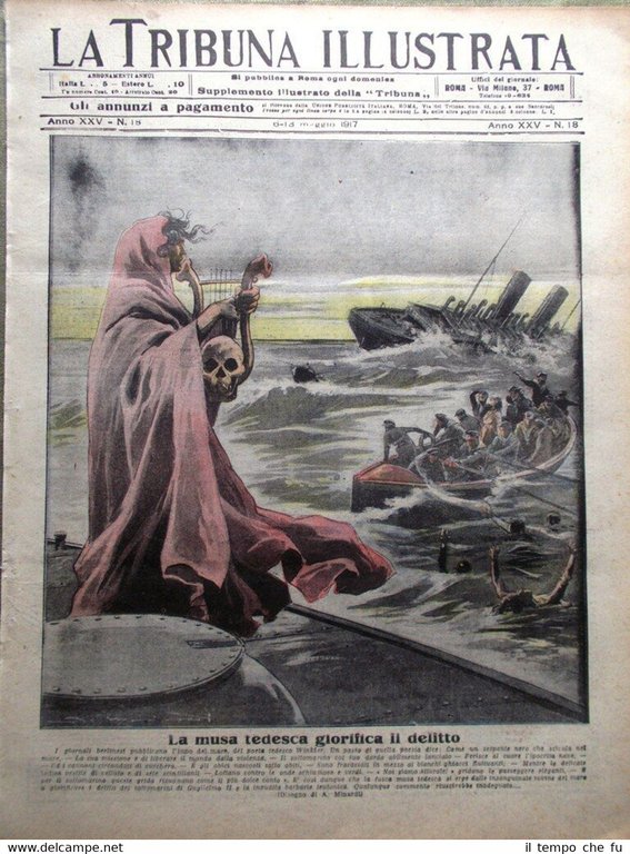 La Tribuna Illustrata - Rivista originale del 6-13 Maggio 1917 Anno 25 - N. 18 Rarità per appassionati e collezionisti Seguono solo alcuni dei fatti descritti, illustrati e fotografati all'interno Illustrato in copertina (segue foto): La musa tedesca glorifica il delitto: i giornalisti berlinesi pubblicano l'inno del mare del poeta tedesco Winkler Illustrato nella retro copertina (segue foto): Un "raid" di cavalieri inglesi che con irresistibile ardore inseguono e sconvolgono le truppe tedesche sulla linea di ritirata dell'Armata di Hindenburg tra l'Aisne e la Mosa Nelle pagine interne: Visioni della nostra guerra (fotografie): mitragliatrice nella zona del Pasubio. Il grande Atlante della guerra: tavola LXXXIII. Galleria scavata sul Pria Forà La guerra gigantesca (fotografie): posto di riconoscimento di un ponte sull'Isonzo. Oro per la patria. .e tanto altro ancora! Qualora vogliate maggiori delucidazioni contattateci In questo negozio troverai un'intera categoria dedicata alle Tribune Illustrate, sotto il link diretto alla collezione: Riviste disponibili Cliccaci sopra, troverai di certo ciò che cerchi! La Tribuna Illustrata fu un settimanale italiano pubblicato a Roma. Insieme a La Domenica del Corriere e a L'Illustrazione Italiana fu il settimanale illustrato preferito dagli Italiani nel periodo che intercorse dalla fine dell'800 all'avvento della televisione. Fondato nel 1890 come supplemento del quotidiano La Tribuna, il primo numero uscì il 6 gennaio, il formato della rivista era cm 27 x 38, un formato poco più grande del tabloid. La prima ed ultima pagina erano a colori, disegnate da pittori e incisori affermati. Ogni numero conteneva 16 pagine. I principali collaboratori furono: Luigi Capuana, Adolfo De Bosis, Alfredo Fabrizi, Gandolin, Giuseppe Giacosa, Attilio Luzzato, Enrico Panzacchi, Rastignac, Attilio Sarfatti, Armand Silvestre, Ettore Socci, Gaspare Ungarelli, Pio Vanzi, Annie Vivanti. Il Corredo iconografico fu di prim'ordine. I principali pittori, disegnatori ed illustratori furono: Basilio Cascella e i figli Tommaso e Michele, Enrico Lionne, Aleardo Terzi, Augusto Bompiani, Roberto Bompiani, Domenico Bruschi, Modesto Faustini, Rubens Santoro, Rafael Senet, Cesare Tiratelli. Tra i romanzi a puntate che vi uscirono ricordiamo: L'invincibile, di Gabriele D'Annunzio Una giovinezza, di Francois Coppée e Zia Aurelia di André Theuriet, questi ultimi due entrambi illustrati da Emile Bayard. Paypal Carta di credito Bonifico bancario Spedizione con posta ordinaria o raccomandata scelta dall'acquirente nel momento del pagamento