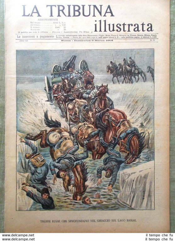 La Tribuna Illustrata Rivista originale del 6 Marzo 1904 Anno 12 - N. 10 Rarità per appassionati e collezionisti Seguono solo alcuni dei fatti descritti, illustrati e fotografati all'interno Illustrato in copertina (segue foto): Truppe russe che sprofondano nel ghiaccio sul lago Baikal Illustrato nella retro copertina (segue foto): La guerra nell'estremo oriente - uno scontro sul fiume Jalu Nelle pagine interne: La tariffa del matrimonio Scene dell'emigrazione In caso di un reduce d'Adua Un monumento a Cavallotti a Palermo La guerra tra la Russia e il Giappone Orribile assassinio in un treno Corriere agrario .e tanto altro ancora! Qualora vogliate maggiori delucidazioni contattateci In questo negozio troverai un'intera categoria dedicata alle Tribune Illustrate, sotto il link diretto alla collezione: Riviste disponibili Cliccaci sopra, troverai di certo ciò che cerchi! La Tribuna Illustrata fu un settimanale italiano pubblicato a Roma. Insieme a La Domenica del Corriere e a L'Illustrazione Italiana fu il settimanale illustrato preferito dagli Italiani nel periodo che intercorse dalla fine dell'800 all'avvento della televisione. Fondato nel 1890 come supplemento del quotidiano La Tribuna, il primo numero uscì il 6 gennaio, il formato della rivista era cm 27 x 38, un formato poco più grande del tabloid. La prima ed ultima pagina erano a colori, disegnate da pittori e incisori affermati. Ogni numero conteneva 16 pagine. I principali collaboratori furono: Luigi Capuana, Adolfo De Bosis, Alfredo Fabrizi, Gandolin, Giuseppe Giacosa, Attilio Luzzato, Enrico Panzacchi, Rastignac, Attilio Sarfatti, Armand Silvestre, Ettore Socci, Gaspare Ungarelli, Pio Vanzi, Annie Vivanti. Il Corredo iconografico fu di prim'ordine. I principali pittori, disegnatori ed illustratori furono: Basilio Cascella e i figli Tommaso e Michele, Enrico Lionne, Aleardo Terzi, Augusto Bompiani, Roberto Bompiani, Domenico Bruschi, Modesto Faustini, Rubens Santoro, Rafael Senet, Cesare Tiratelli. Tra i romanzi a puntate che vi uscirono ricordiamo: L'invincibile, di Gabriele D'Annunzio Una giovinezza, di Francois Coppée e Zia Aurelia di André Theuriet, questi ultimi due entrambi illustrati da Emile Bayard. Paypal Carta di credito Bonifico bancario Spedizione con posta prioritaria o raccomandata scelta dall'acquirente nel momento del pagamento