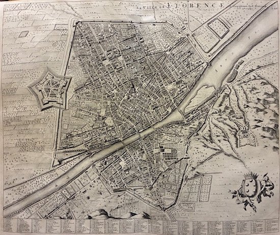 Incisione originale su rame (cm. 60x50 più margini bianchi) tratta dalla monumentale opera ‘Nouveau Theatre de l’Italie’, riedizione del ‘Theatrum Civitatum’ pubblicato da Joan Blaeu nel 1663. Esemplare in nitida impressione ed ottimo stato di conservazione. Nella parte inferiore dello specchio di stampa, al di sotto della splendida pianta prospettica, legenda con rimandi a 245 luoghi notabili della città di Firenze.Nel 1672 la tipografia di Blaeu fu distrutta da un incendio e l’editore Mortier rilevò ciò che restava delle lastre di rame (alcune delle quali ancora inedite), aggiunse nuove tavole e ritoccò - seppur con piccole modifiche - buona parte delle vedute originarie.