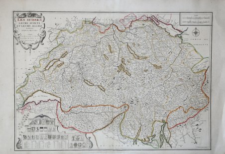 Bell'esemplare della mappa della Svizzera di De Fer, aggiornata e corretta dal suo successore, Guillaume Danet. Mappa superbamente dettagliata, con 13 stemmi dei cantoni svizzeri e 11 stemmi degli alleati. Nicolas de Fer (1646-1720) è stato uno dei più grandi cartografi, incisori ed editori del XVII secolo. Il padre, Antoine de Fer, era un modesto mercante di stampe che lavorava sull’Ile del la Cité a Parigi; collaborò con Nicolas I Berey, poi con Melchior Tavernier e, quindi, con Jacques Lagnet. Nel 1652 Antoine adotta l’insegna commerciale della “Sphére royale”, già appartenuta a Tavernier; nel 1657 stampa ' Cartes de géographie, una piccola raccolta tascabile di Pierre Duval. Nel 1667 si firmava “merchand de cartes Gèographique”; proseguì l’attività fino al 1686, quando lasciò la tipografia nelle mani del figlio Nicolas, che aveva fatto da apprendista all’incisore parigino Louis Spirinx e aveva già realizzato la sua prima mappa del Canal du Midi, all’età di soli 23 anni. Nel 1689 realizzò una mappa della Franche-Comté per onorare il Grand Dauphine - Luigi di Francia (1661-1711), primogenito ed erede del re Luigi XIV di Francia, impegnato al comando di una campagna di conquistare di nuovi territori sul Reno. In seguito, venne nominato geografo ufficiale del Delfinato e la sua produzione fu strettamente legata agli interessi della corona francese: ad esempio, ' Forces De L’Europe Ou Introduction A La Fortification, pubblicato nel 1695, che mostrava le nuove fortificazioni progettate dall’innovativo ingegnere francese Sébastien de Vauban. Fu il geografo ufficiale anche di Filippo V e Luigi XIV (entrambi i rami francese e spagnolo della Casa di Borbone) e infine, nel 1720, del Papa. De Fer pubblicò l’Atlas curieux où le Monde représenté dans les cartes générales et particulièrs du Ciel et de ' la Terre ' tra il 1700 e il 1705, aggiungendo ogni volta delle nuove tavole geografiche. La sua opera più maestosa rimane l’Atlas Royal, dans l’Isle du Palais sur le Quay de l'Orloge a la Sphere royale ' (1693). Alla sua morte, l’attività fu ereditata da suo genero Guillaume Danet, che si unì poi con Jacques-François Benard. Acquaforte, con colore di contorno originale, buone condizioni. A nice example of De Fer's map of Switzerland, as updated and corrected by his successor, Guillaume Danet. Superbly detailed map, with 13 coats of arms for the Swiss Cantons and 11 coats of arms for the allies and 7 "Sujets." Nicolas de Fer (1646-1720) was the youngest son of Parisian print and map seller, Antoine de Fer [d.1673]. He became an official geographer to both French and Spanish kings. After his death in 1720, the business passed to his sons-in-law, Guillaume Danet and Jacques-Francois Benard. ' Etching, with original outline colour, good condition. Cfr.