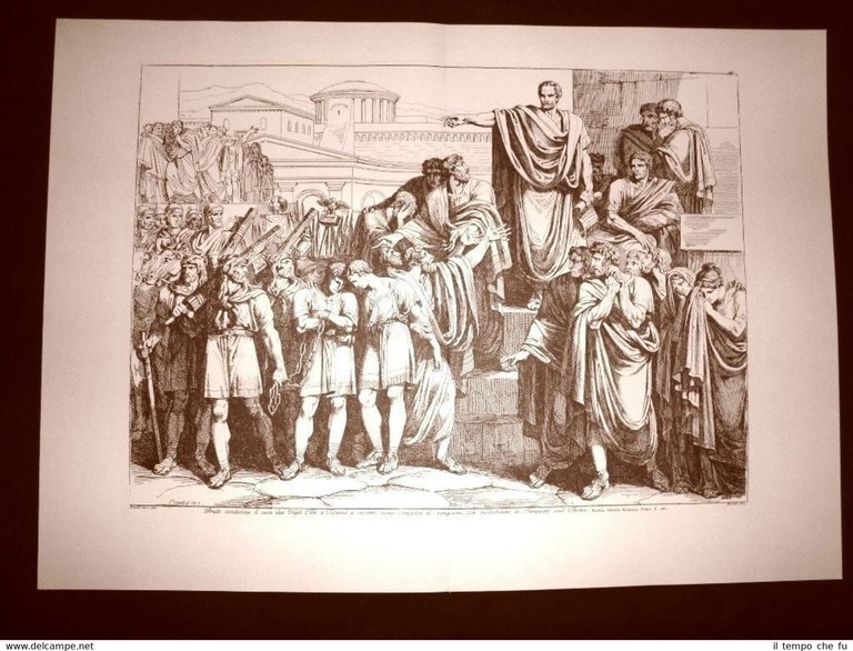 Litografia di Bartolomeo Pinelli Di grandi dimensioni e stampata nel 1973 su carta speciale Facente parte della collezione: "L'Istoria Romana illustrata in cento tavole" Bruto condanna a morte i suoi due figli Tito e Tiberio complici nella congiura per ristabilire i Tarquini sul trono Litografie-089 Dimensioni Cm 56,00 x 40,00 Bartolomeo Pinelli (Roma, 20 novembre 1781 - Roma, 1º aprile 1835) è stato un incisore, pittore e ceramista italiano. Artista grafico estremamente prolifico, è stato recentemente stimato che abbia prodotto circa quattromila incisioni e diecimila disegni. Nelle sue stampe ha illustrato i costumi dei popoli italiani, i grandi capolavori della letteratura: Virgilio, Dante, Tasso, Ariosto, Cervantes, Manzoni, e soggetti della storia romana, greca, napoleonica ecc. Il tema in generale più ricorrente è Roma, i suoi abitanti, i suoi monumenti, la città antica e quella a lui contemporanea. Ha avuto fra i propri allievi il noto ritrattista goriziano Giuseppe Tominz. La sua opera di illustratore possiede, oltre all'intrinseco valore artistico, un rilevante significato documentario per l'etnografia di Roma, dell'Italia e della Svizzera.Nacque a Roma il 20 novembre 1781, da Giovanni Battista e Francesca Gianfarani, in un edificio del rione di Trastevere oggi non più esistente, ma in corrispondenza del quale si trovano una lapide ed un busto bronzeo in suo onore.Suo padre era un modellatore di statue devozionali, e lo avviò all'arte della manipolazione della ceramica. Tuttavia le sue capacità nel campo della figurazione si sarebbero esplicate soprattutto attraverso le tecniche dell'incisione, del disegno e della pittura. Si formò prima all'Accademia di Belle Arti di Bologna, città dove la famiglia si era trasferita nel 1792, e poi all'Accademia di San Luca a Roma, dove era tornato nel 1799. Nello stesso 1799 cominciò la collaborazione con Franz Kaisermann, per il quale dipinse le figure delle sue vedute all'acquerello. Nel frattempo diede inizio ai suoi studi, sbocciati poi (1807) nell'Album di trentasei acquerelli di Scene e Costumi di Roma e del Lazio.Quanto al suo aspetto fisico e alle sue abitudini comportamentali, così scrisse di lui un contemporaneo:« Fu Bartolomeo Pinelli di media statura, di fisonomia e di portamento vivaci portò folta la capigliatura che a lunghi boccoli gli incorniciava il viso e gli scendeva inanellata dinanzi [.] i tratti del viso ebbe marcati, ma regolari, e non portò che i piccoli mustacchi come appare anche nel suo busto che fu posto al Pincio. Di costumi fu bizzarro, amante anche troppo dello scherzo. Vestì negligentemente a modo del popolo e lo si vide sempre girare per Roma accompagnato da due grandi mastini e munito di mazza che aveva per pomo una figura di bronzo. Era facile all'ira quantunque fosse di consueto allegro e faceto fu scettico [leggi:ateo] come molti degli uomini di ingegno del suo tempo e fu patriota a suo modo, cioè innamorato di Roma antica, nella quale concentrò tutti i suoi affetti »(David Silvagni, La corte e la società romana nei secoli XVII e XIX, Roma, Forzani & C. Tipografi del Senato, 1881-4, voll. 3, vol. III, p. 395)Del 1809 è la sua prima serie di incisioni dal titolo Raccolta di cinquanta costumi pittoreschi incisi all'acquaforte. Fu probabilmente nello stesso anno che contrasse il matrimonio con Mariangela Gatti, avvenuto con rito repubblicano e dal quale nacquero una figlia femmina, forse morta in giovane età e di cui non si conoscono nemmeno gli estremi anagrafici, e un maschio, Achille. Nel 1816 realizzò le illustrazioni per la Storia Romana e nel 1821 quelle per la Storia Greca. Tra il 1822 e il 1823realizzò le cinquantadue tavole per il Meo Patacca. Il 25 agosto 1834, per la sua indifferenza al precetto pasquale, ricevette con disprezzo l'interdetto. Morì povero il 1º aprile del 1835, lasciando incompleta l'illustrazione del Maggio romanesco di Giovanni Camillo Peresio.Oltre al repertorio di immagini dedicate ai costumi romani ha illustrato numerosi libri, realizzando cicli ispirati a Iliade, Odissea, Eneide e alla mitologia greco-romana. Opere che maggiormente rivelano l'impronta del neoclassicismo.Oreste Raggi, nel suo libretto scritto il 1835, l'anno stesso della morte dell'Artista, cita oltre a moltissimi disegni ed acquerelli, circa 40 raccolte di stampe, pubblicate a Roma con una decina di editori diversi.Tra queste:o Raccolta di Costumi di Roma (1809) - 50 ramio Altra raccolta di Costumi di Roma (?) - 50 ramio Il carnevale di Roma (?) - "un rame solo"o La Storia Romana - 101 stampeo La storia degli Imperatori, cominciando da Ottavio - 101 stampeo Dante, Inferno, Purgatorio e Paradiso - 145 stampeo Costumi della Campagna Romana (1823) - 50 ramio Il Tasso - La Gerusalemme Liberata - 72 stampeo L'Ariosto - L'Orlando Furioso - 100 stampeo Eneidi (sic) di Virgilio - 50 ramio Raccolta di costumi antichio Istoria Greca - rami 100o Costumi del Regno di Napoli - 50 rami - (1828)o Meo Patacca - 50 ramio Raccolta di quindici c