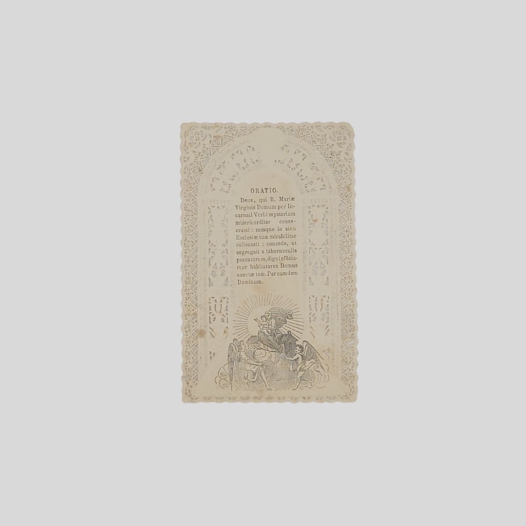 Santino d’epoca bordo in merletto, interamente traforato, s.d. (XIX sec), cm 7×11,1. Al verso orazione il latino con incisione raffigurante Madonna con Angeli. Lievi tracce d’uso e piccola mancanza al margine sinistro. Santino del XIX sec., raffigurante Madonna nera di Loreto (Virgo Lauretana) patrona degli aeronauti, nota per il prodigioso trasporto della Santa Casa di Nazareth.