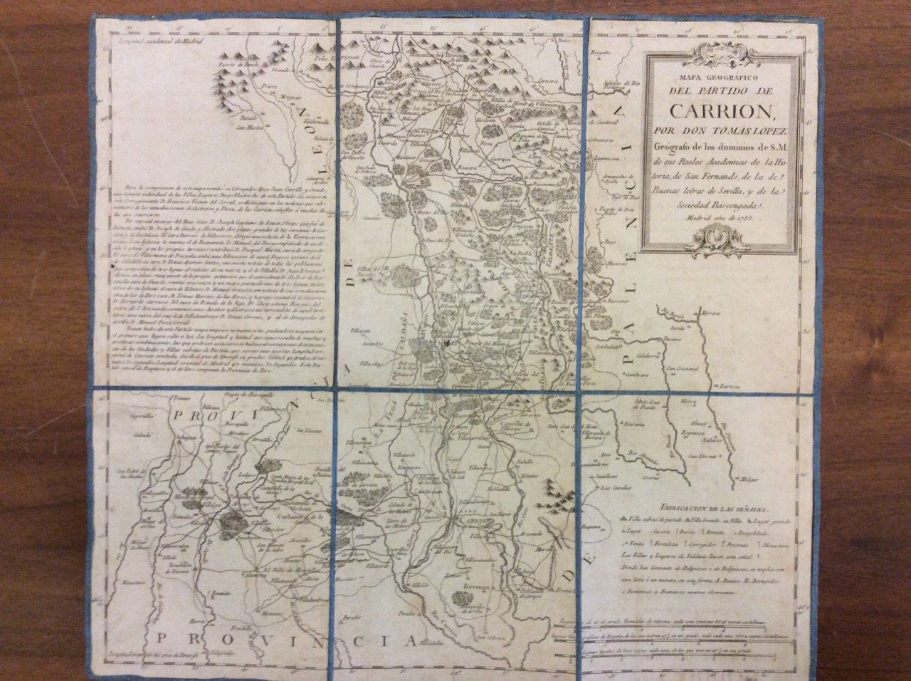 Di questo importante geografo spagnolo (1730-1802), offriamo la carta del Partido de Carrion, montata su tela, di cm. 36 x 40, suddivisa in 6 riquadri. Cfr. Tooley's Dictionary of Mapmakers, p. 400.Ben conservata.