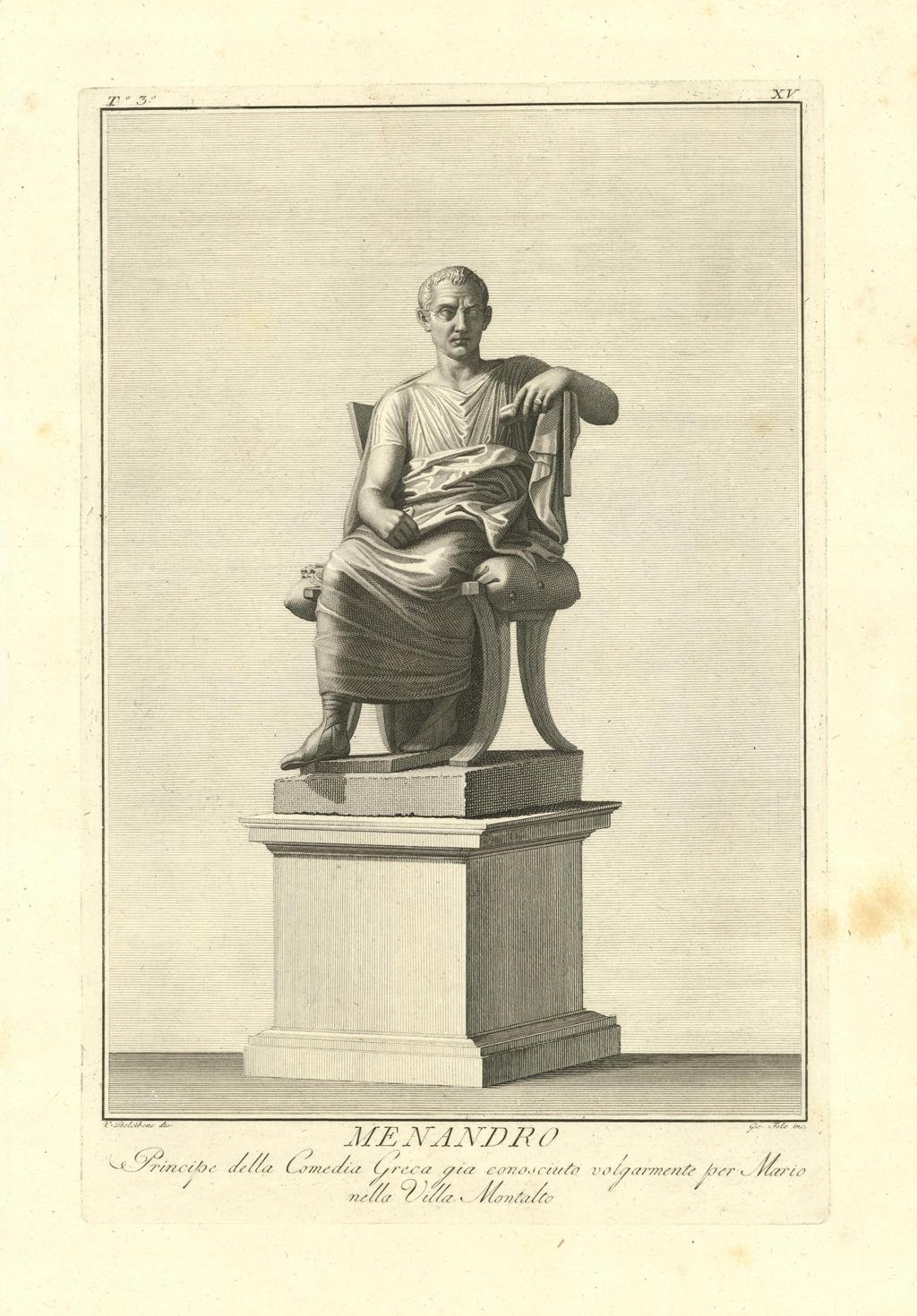 Questo simulacro, con sfondo inciso, raffigura Menandro (342 a.C. – 291 a.C.) un commediografo greco antico. Fu il massimo esponente della Commedia Nuova. La statua disinvolta siede su un bel sedile semicircolare, indossa dei calzari e una tunica ricca nel panneggiamento. Inserita nell'opera "Il Museo Pio-Clementino descritto da Ennio Quirino Visconti - Tomo terzo - Dedicato alla Santità di Nostro Signore PIO SESTO Pontefice Massimo. Edito da Luigi Mirri / Mercante di quadri incontro il Palazzo Bernini. In Roma MDCCLXXXIV con Privilegio Pontificio. Leggero foxing