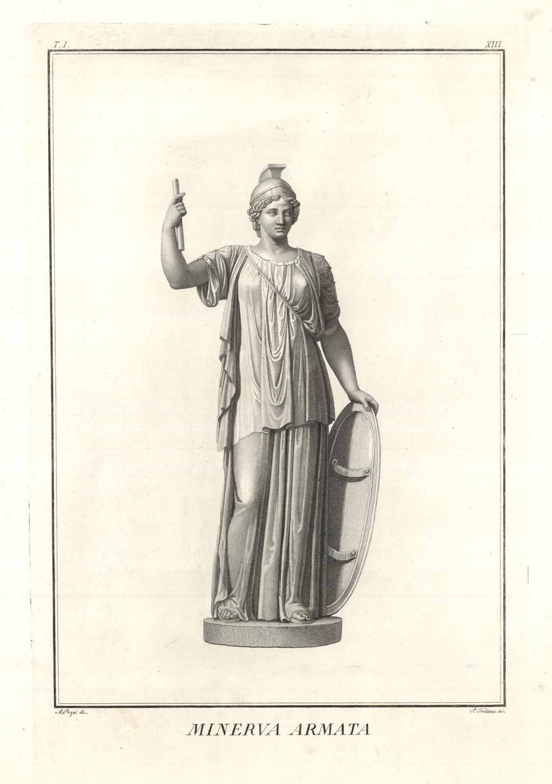 Incisione raffigurante Minerva inserita nel tomo primo dell'opera "Il Museo Chiaramonti aggiunto al Pio-Clementino da N. S. Pio VII P. N." Pubblicata da Antonio d'Este e Gaspare Capparone a Roma nel 1808. La divinità vergine della guerra giusta, della saggezza, dell'ingegno qui rappresentata col suo elmo, lo scudo e l'asta innalzata. Tunica doppia morbida, annodata da fibule alle spalle, veste fino ai piedi la divinità. Autore: Pozzi A. dis. & Fontana P. inc. Luogo: Minerva. Anno: 1808. Tecnica: incisione in rame. Dimensioni: 620x430 il foglio.