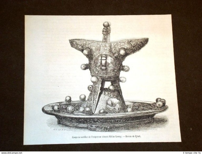 Rara Incisione Estratta da Rivista d'epoca del 1871 Moda e costume nel 1871 Coppa sacrificale dell'Imperatore cinese Khian Loung MAG1871-002T Dimensioni Cm 18,00 x 16,00 Qualora vogliate delle scansioni migliori contattateci, soddisferemo ogni vostra richiesta. Paypal Carta di credito Bonifico bancario Accuratamente adagiate su un cartoncino e protette da pellicola trasparente rigida il tutto viene inserito dentro plico di adeguate dimensioni per proteggerne l'integrità