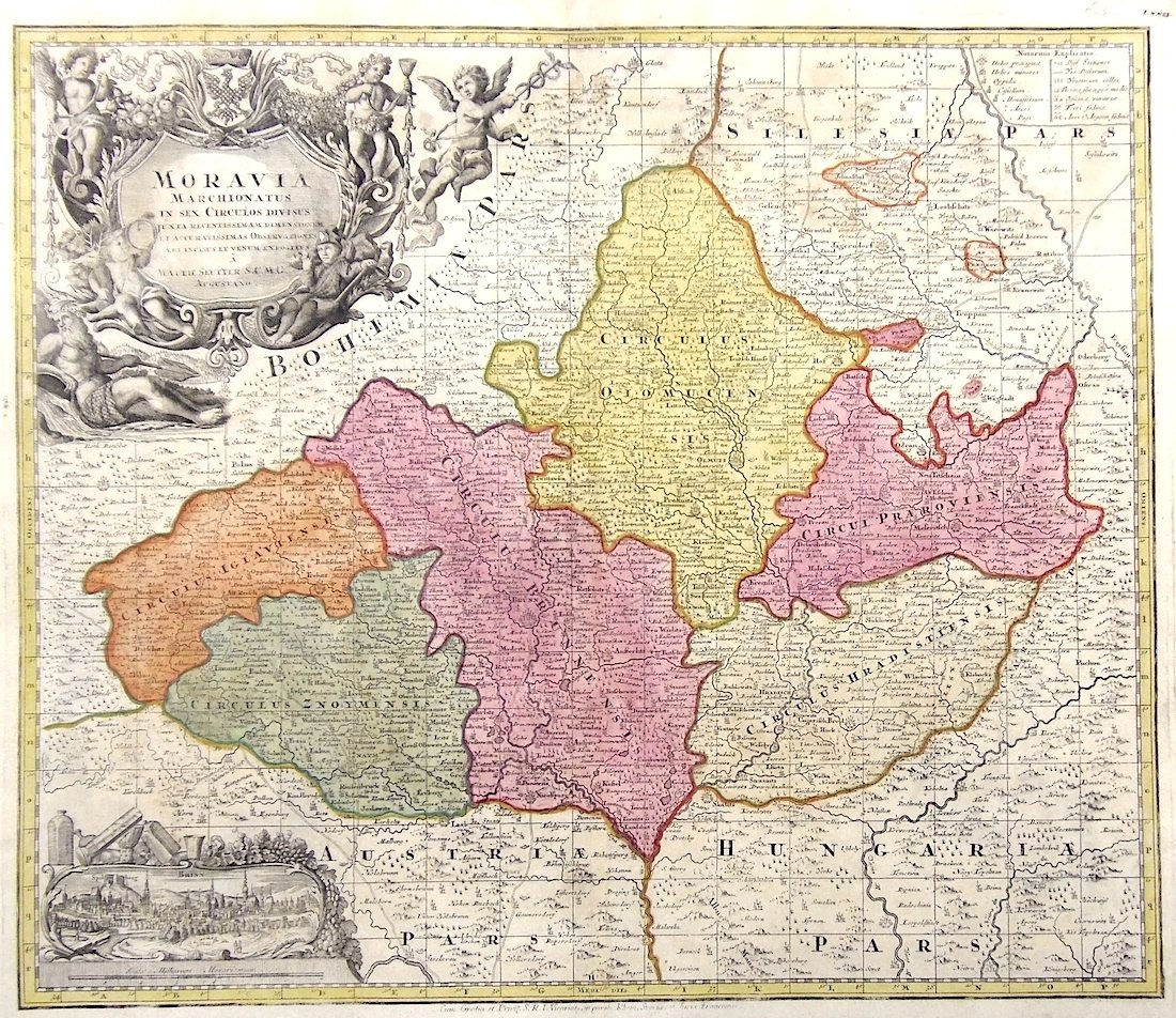 Incisione in rame, coloritura originale d'epoca ritoccata, con ricchi e fascinosi cartigli in bianco nero inclusa una veduta di Brno in basso. Mm 498x580. Seutter, dopo un apprendistato presso Homann a Norimberga, trasferitosi ad Augsburg verso il 1710, aprì la propria attività superando il maestro sotto il profilo della bellezza: le sue carte hanno sempre colori brillanti e cartigli elaborati. Buon esemplare con leggero alone di umidità in alto. <BR>Copperplate, original colour. Mm 498x580. Good condition with light damp stains at top. Seutter, one of the most celebrated eighteenth century German mapmakers, after having worked with Homann in Nuremberg, started his own business in Augsburg around 1710. His maps always have elaborate cartouches and are very decorative and printed on good paper. <BR>