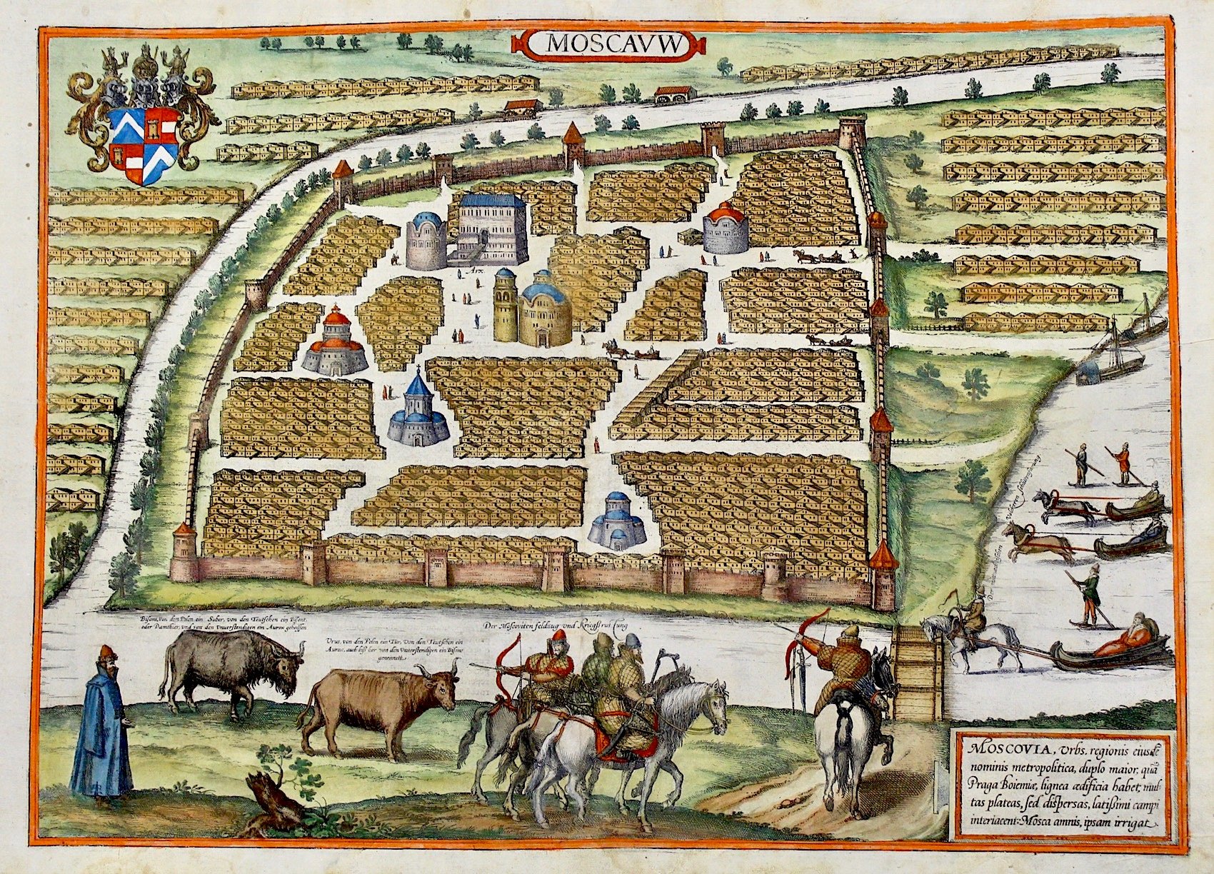 Incisione in rame, mm 350x490. Fascinosa veduta panoramica della metropoli russa a volo d'uccello. La città è colta in modo molto schematico, circondata da un muro. Tratta da "Civitates Orbis Terrarum", pietra miliare del vedutismo, stampata dal 1572 al 1617 in 6 volumi pubblicati in anni differenti in varie lingue, compilata e scritta da Georg Braun, mentre Frans Hogenberg fu autore delle incisioni insieme a Simon Novellanus, generalmente da soggetti di Georg Hoefnagel. Buon esemplare con qualche restauro in alto, mentre in basso è stata rifatta parte del margine e della cornice di inquadramento.<BR>(Taschen): "Moscow is shown very schematically in a bird's-eye view; between the groups of identical houses are e few people and some very simplified large buildings. In contradiction to the text, the city is surrounded by a wall. According to legend, Moscow was founded in 1147 by Yuri Dolgoruki; by the 15th century it had become a large city with decisive wordly and religious power. The symbol of wordly power is the Kremlin, which was constructed from 1485 to 1495 and extended in several stages up to 1530. In 1472, through the marriage of Ivan III with the Byzantine Princess Sophia Palaiologos, the niece of the last East Roman emperor, Moscow also became the centre of the Russian-Orthodox church. By 1600 the fast-growing city already had more than 100,000 inhabitants. On the right people can be seen taking sleigh rides on the Moskva, which is incongruous with the vegetation, and the foreground Russian soldiers, here called "Moscovites", are depicted"<BR>Copper engraving, mm 350x490. Fascinating bird-eye view of the russian capital, from "Civitates Orbis Terrarum". Braun gathered together vast amounts of information and draft plans to produce over 500 city views/maps published in six parts between 1572 and 1617. Most of these engravings were made by Simon Novellanus and Frans Hogenberg, many after drawings by Georg Hoefnagel. Good example with some restorations affecting text in upper and bottom margin: some tears and worm track in upper margin, portion of bottom margin and frame restored. (Taschen): "Moscow is shown very schematically in a bird's-eye view; between the groups of identical houses are e few people and some very simplified large buildings. In contradiction to the text, the city is surrounded by a wall. According to legend, Moscow was founded in 1147 by Yuri Dolgoruki; by the 15th century it had become a large city with decisive wordly and religious power. The symbol of wordly power is the Kremlin, which was constructed from 1485 to 1495 and extended in several stages up to 1530. In 1472, through the marriage of Ivan III with the Byzantine Princess Sophia Palaiologos, the niece of the last East Roman emperor, Moscow also became the centre of the Russian-Orthodox church. By 1600 the fast-growing city already had more than 100,000 inhabitants. On the right people can be seen taking sleigh rides on the Moskva, which is incongruous with the vegetation, and the foreground Russian soldiers, here called "Moscovites", are depicted"<BR><BR>