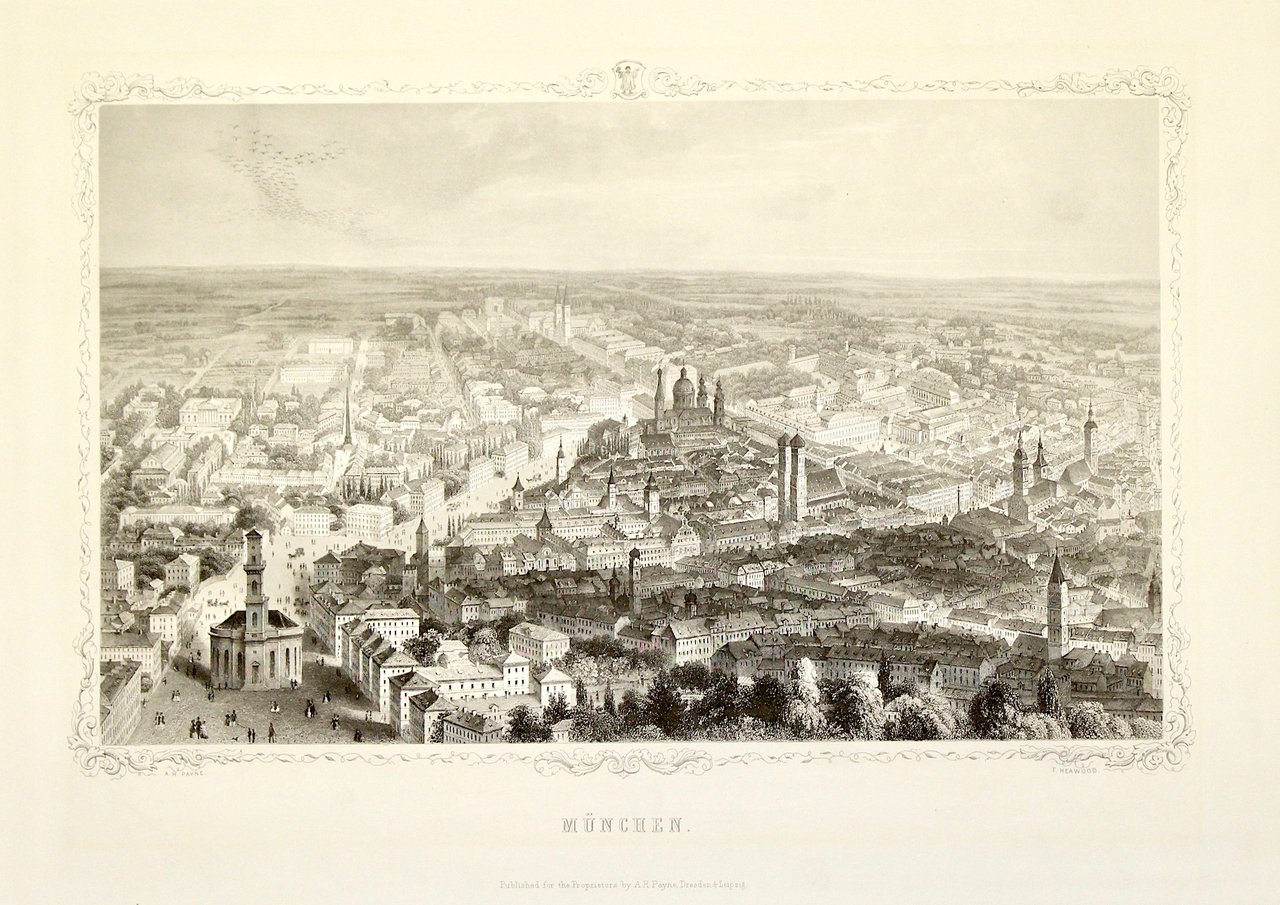 Incisione in acciaio, mm 203x334; Bella veduta aerea generale del centro cittadino. Firmata a sin. "A.H. Payne". L'incisione è circondata da una leggera bordure. Ottime condizioni<BR>Steel engraving, mm 203x334; nice general bird-eye view of the historical centre. Signed "A.H. Payne" on the left. Very good condition. <BR>
