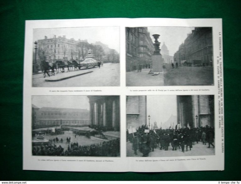 Rara Stampa Estratta da Rivista d'epoca del 1920 Nel 1920 La Cerimonia per il trasporto della salma di un eroe ignoto caduto in guerra e del cuore di Gambetta al Pantheon di Parigi. Il carro che trasporto l'urna contenente il cuore di Gambetta Le torcie preparate nelle vie di Parigi per il corteo dell'eroe ignoto e del cuore di Gambetta la salma dell'eroe ignoto e l'urna contenente il cuore di Gambetta, davanti al Pantheon la salma dell'eroe ignoto e l'urna contenente il cuore di Gambetta, sotto l'arco di Trionfo + Le sale provvisorie nelle quali è raccolto un gruppo di capolavori della R. Pinacoteca di Brera II1920-07 Dimensioni Cm 35,00 x 27,00 + 27,00 x 16,00 Qualora vogliate delle scansioni migliori contattateci, soddisferemo ogni vostra richiesta. PaypalCarta di creditoBonifico bancario Accuratamente adagiate su un cartoncino e protette da pellicola trasparente rigida,il tutto viene inserito dentro plico di adeguate dimensioni per proteggerne l'integrità.