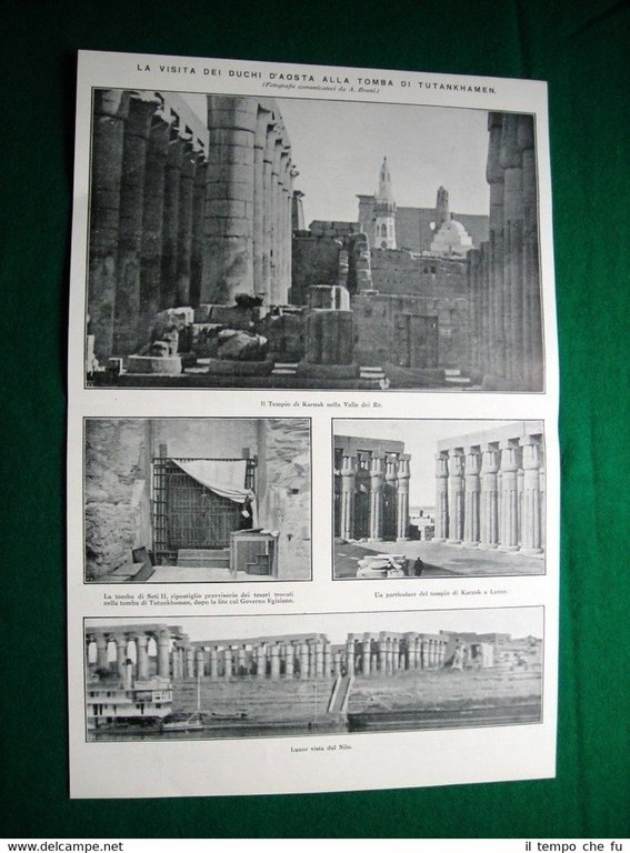 Rara Stampa Estratta da Rivista d'epoca del 1924 Nel 1924 La visita dei Duchi D'Aosta alla Tomba di Tutankhamen. Il Tempio di Karnak nella Valle dei Re la tomba di Seti II, ripostiglio provvisorio dei tesori trovati nella tomba di Tutankhamen, dopo la lite col Governo Egiziano un particolare del Tempio di Karnak a Luxor Luxor vista dal Nilo + Arturo Stanghellini II1924-07 Dimensioni Cm 24,00 x 37,00 + 7,00 x 10,00 Qualora vogliate delle scansioni migliori contattateci, soddisferemo ogni vostra richiesta. PaypalCarta di creditoBonifico bancario Accuratamente adagiate su un cartoncino e protette da pellicola trasparente rigida,il tutto viene inserito dentro plico di adeguate dimensioni per proteggerne l'integrità.