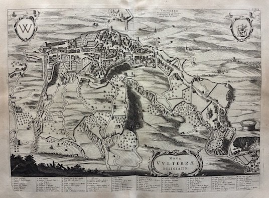 Incisione originale su rame (cm. 57x41 più ampi margini bianchi) tratta dalla monumentale opera ‘Nouveau Theatre de l’Italie’, riedizione del ‘Theatrum Civitatum’ pubblicato da Joan Blaeu nel 1663. Esemplare in nitida impressione ed ottimo stato di conservazione. Nella parte inferiore dello specchio di stampa, al di sotto della splendida pianta prospettica, legenda con rimandi a 73 luoghi notabili della città di Volterra.Nel 1672 la tipografia di Blaeu fu distrutta da un incendio e l’editore Mortier rilevò ciò che restava delle lastre di rame (alcune delle quali ancora inedite), aggiunse nuove tavole e ritoccò - seppur con piccole modifiche - buona parte delle vedute originarie.