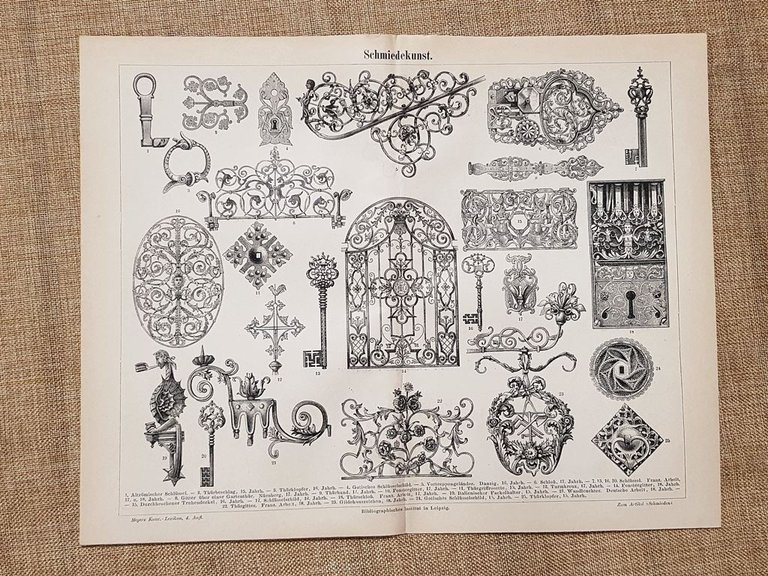 Oggetti o lavorazioni in ferro Tavola del 1890 Rara tavola estratta da pubblicazione del 1890 Stampata su carta non retroscritta Oggetti o lavorazioni in ferro Dimensioni: Cm 29,00 x 24,00 Codice prodotto: GEO-161