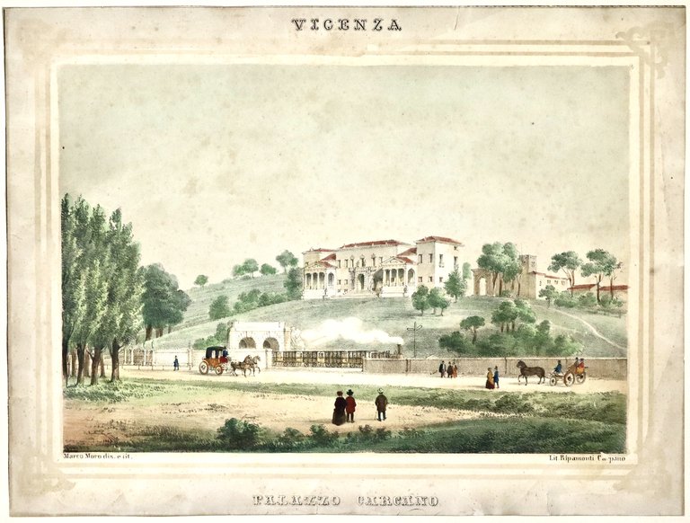 Litografia colorata a mano di mm 260x345. Tratta dall'opera "Vicenza e suoi dintorni" composta da 31 tavole rappresentanti gli scorci più caratteristici e rappresentativi della città e dintorni. Buon esemplare seppur con fioriture e aloni di umidità marginali. Cfr Vicenza città bellissima, 245.
