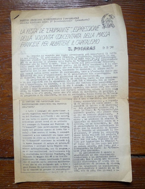 PARTITO COMUNISTA RIVOLUZIONARIO,Juan Posadas,LA FESTA DE L'HUMANITÉ,1974